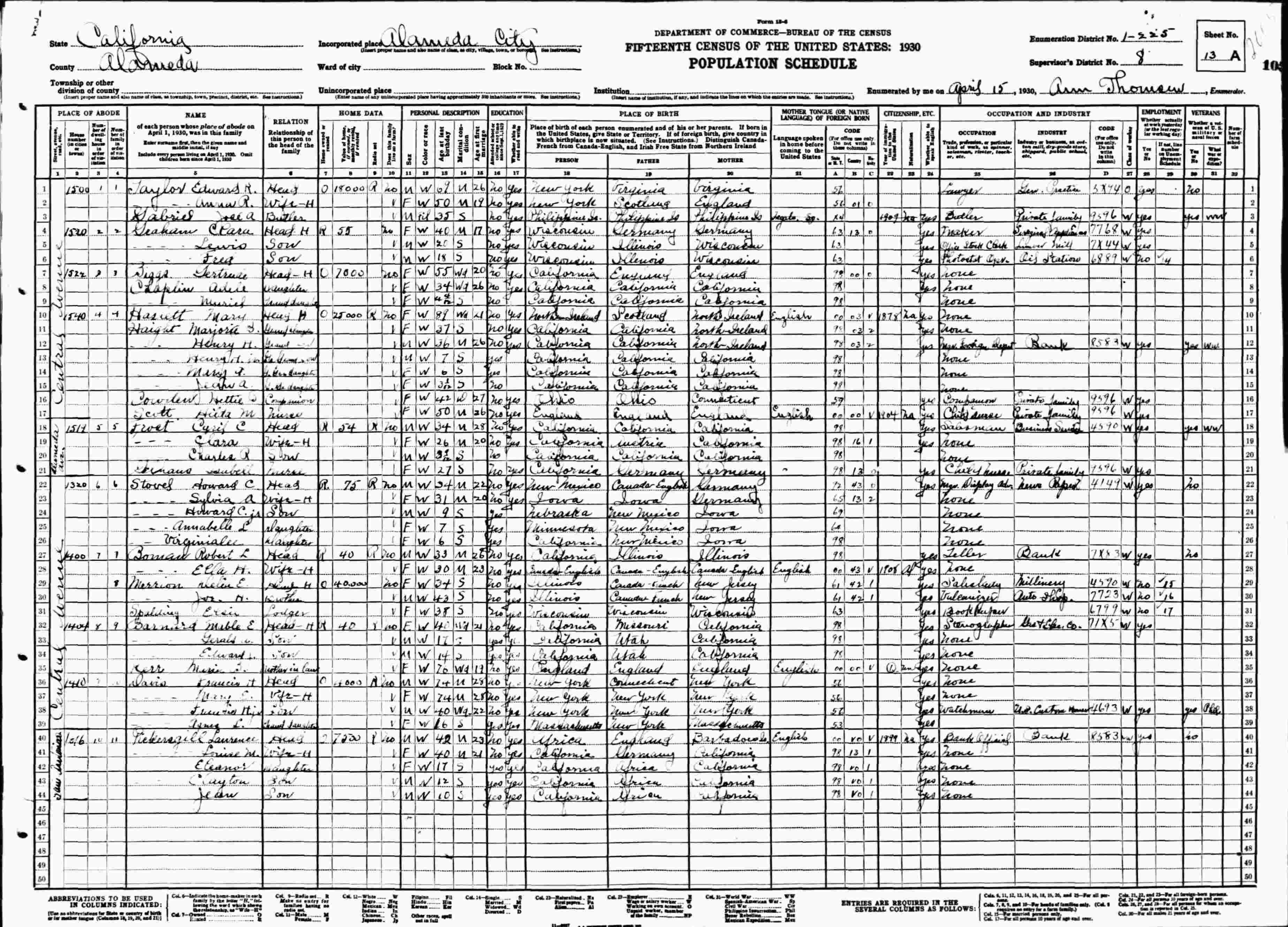 April 15, 1930 - 1320 Central Avenue, Supervisor's District 8, Enumeration District 1-225, Alameda, Alameda County, California.