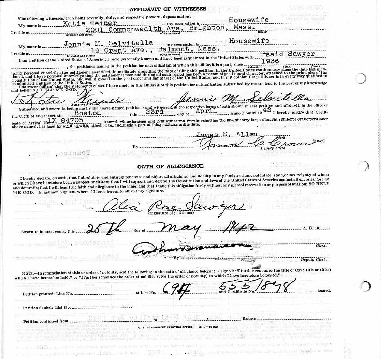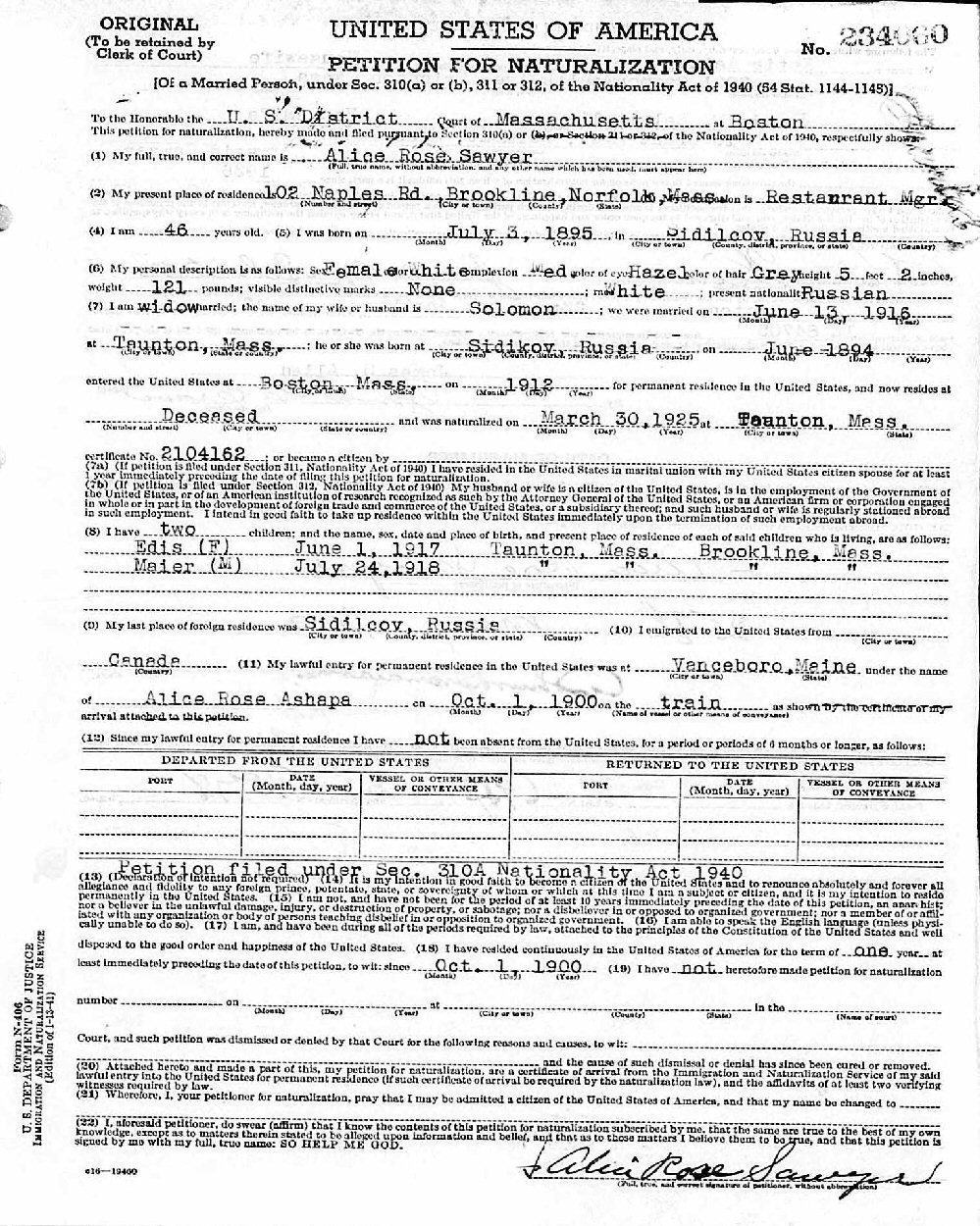 Married: (1) Solomon Saul Sawyer June 13, 1916 in Taunton, Bristol County, Massachusetts.