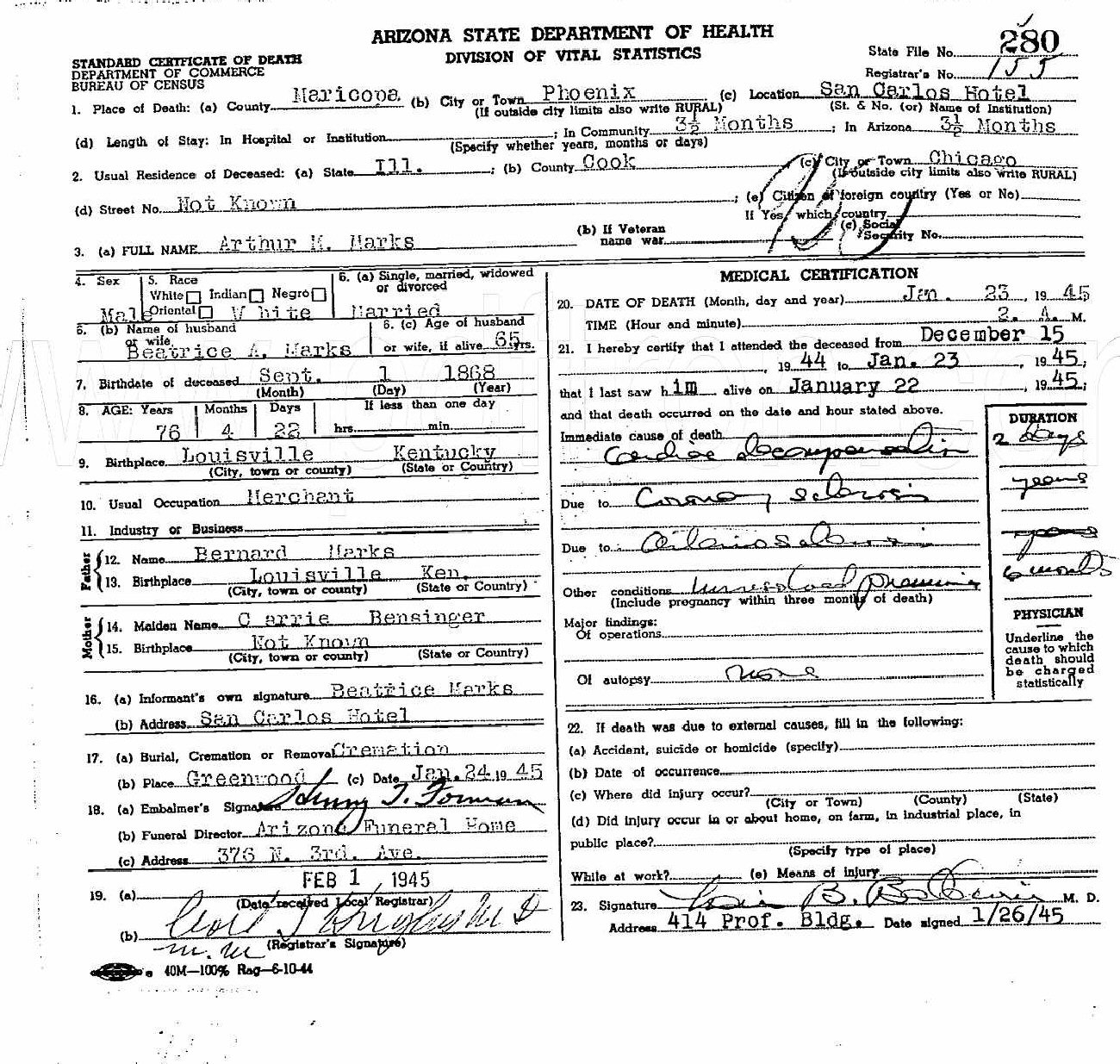 Died: January 23, 1945 in Phoenix, Maricopa County, Arizona.