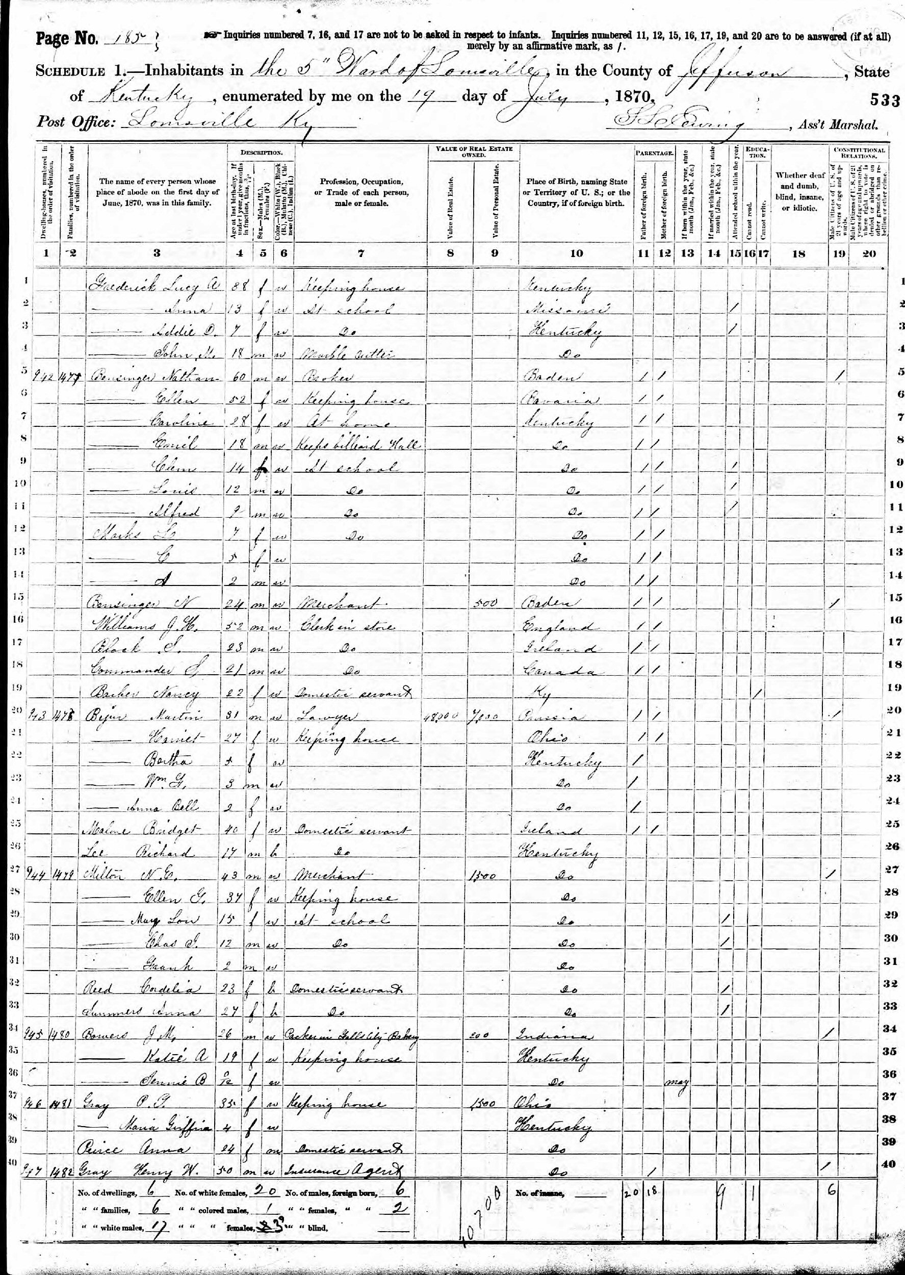 July 19, 1870 - Ward 5, Louisville, Jefferson County, Kentucky (w/maternal grandparents. Mother listed with maiden name, no father there.)