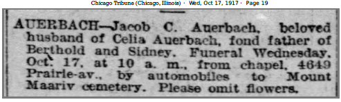 Buried: October 17, 1917 in Mt. Mayriv Cemetery, Chicago, Cook County, Illinois.