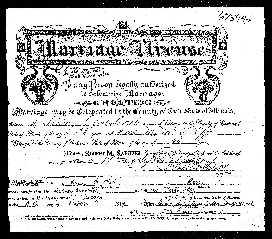 Married: Sidney Auerbach October 4, 1914 in Chicago, Cook County, Illinois.