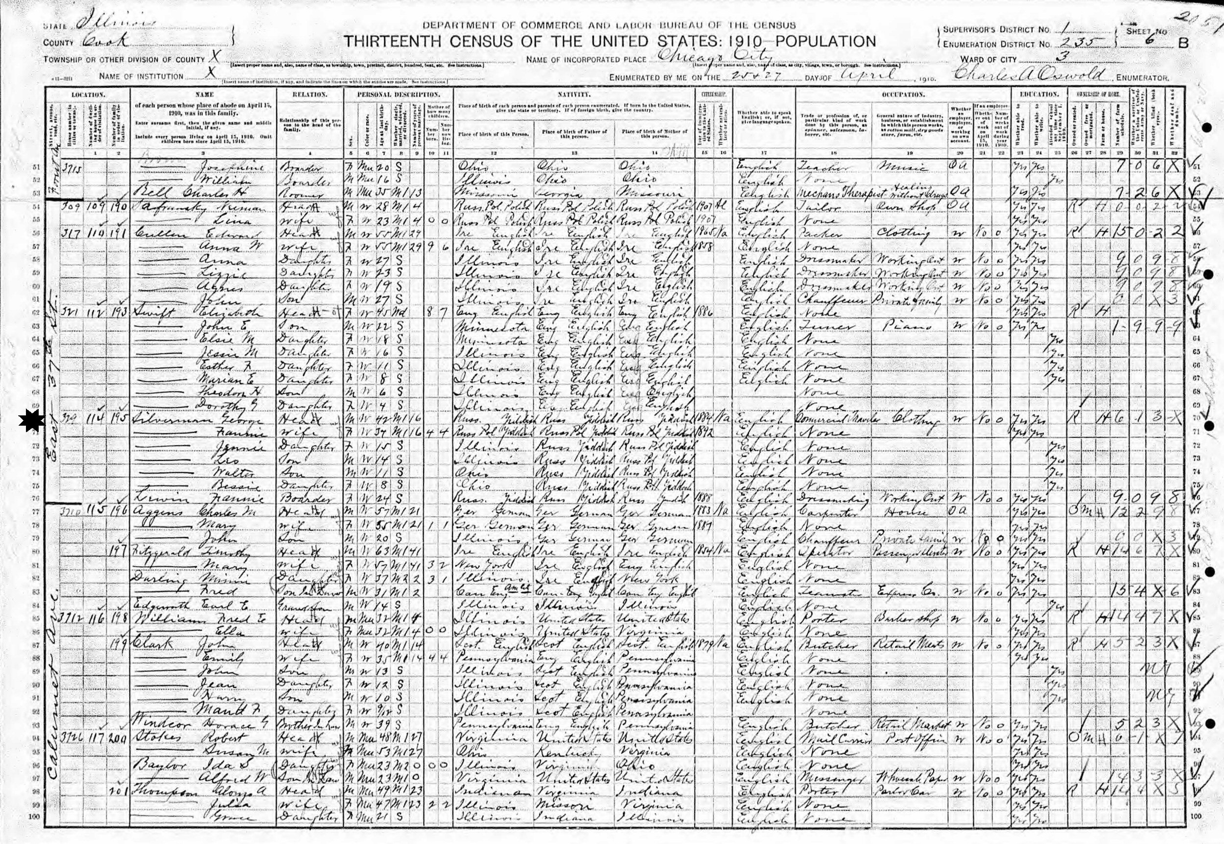 April 25-27, 1910 - 329 East 37th Street, Ward 3, Supervisor's District 1, Enumeration District 235, Chicago, Cook County, Illinois.