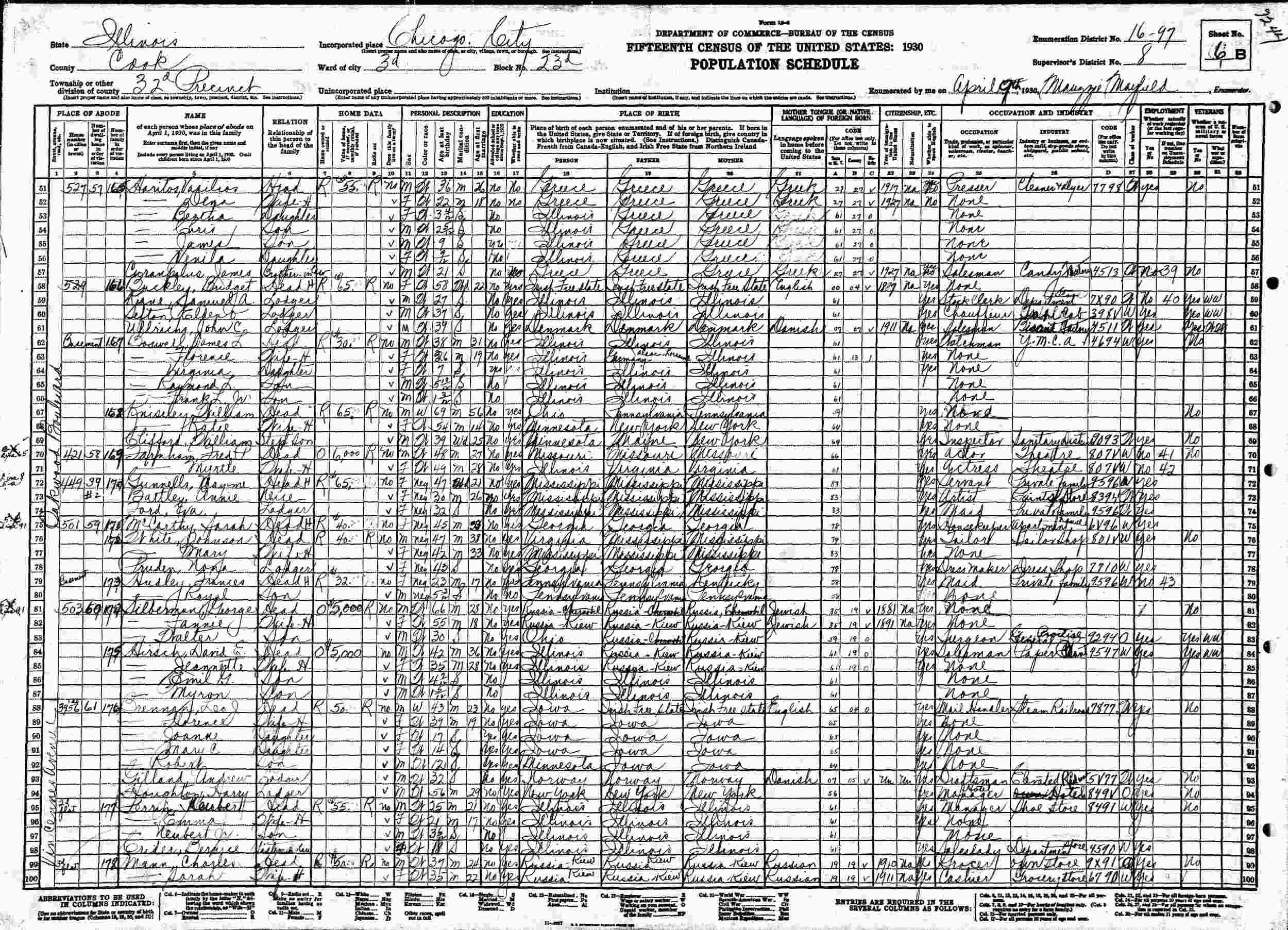 April 9, 1930 - 503 Oakwood Boulevard, Precinct 32, Ward 3, Block 23, Supervisor's District 8, Enumeration District 16-97, Chicago, Cook County, Illinois.