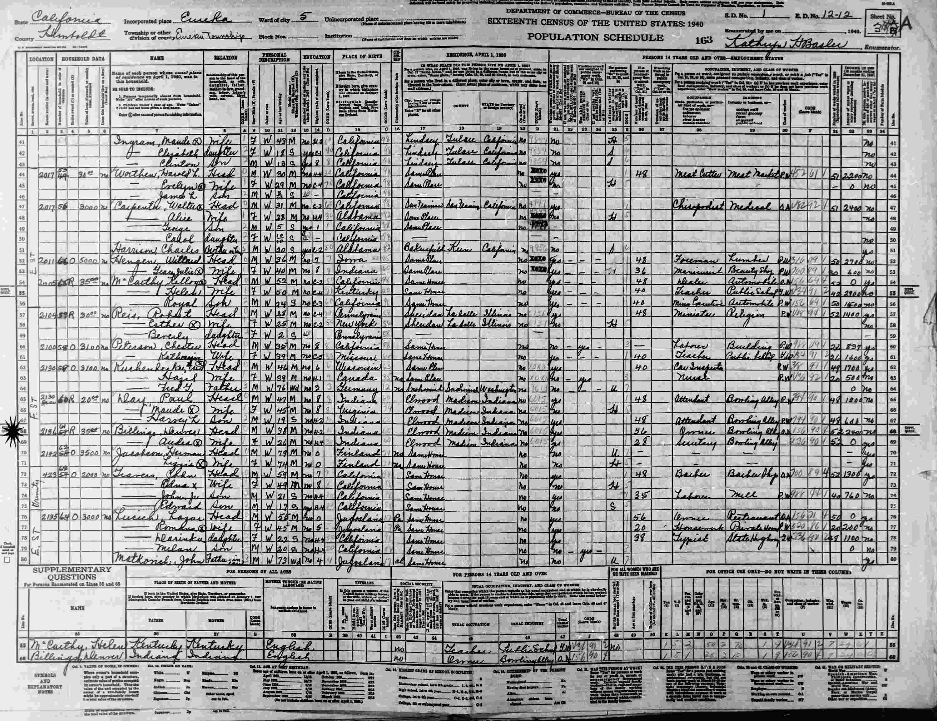 1940 - 2136 F Street, Ward 1, Supervisor's District 1, Enumeration District 12-12, Eureka, Humboldt County, California.