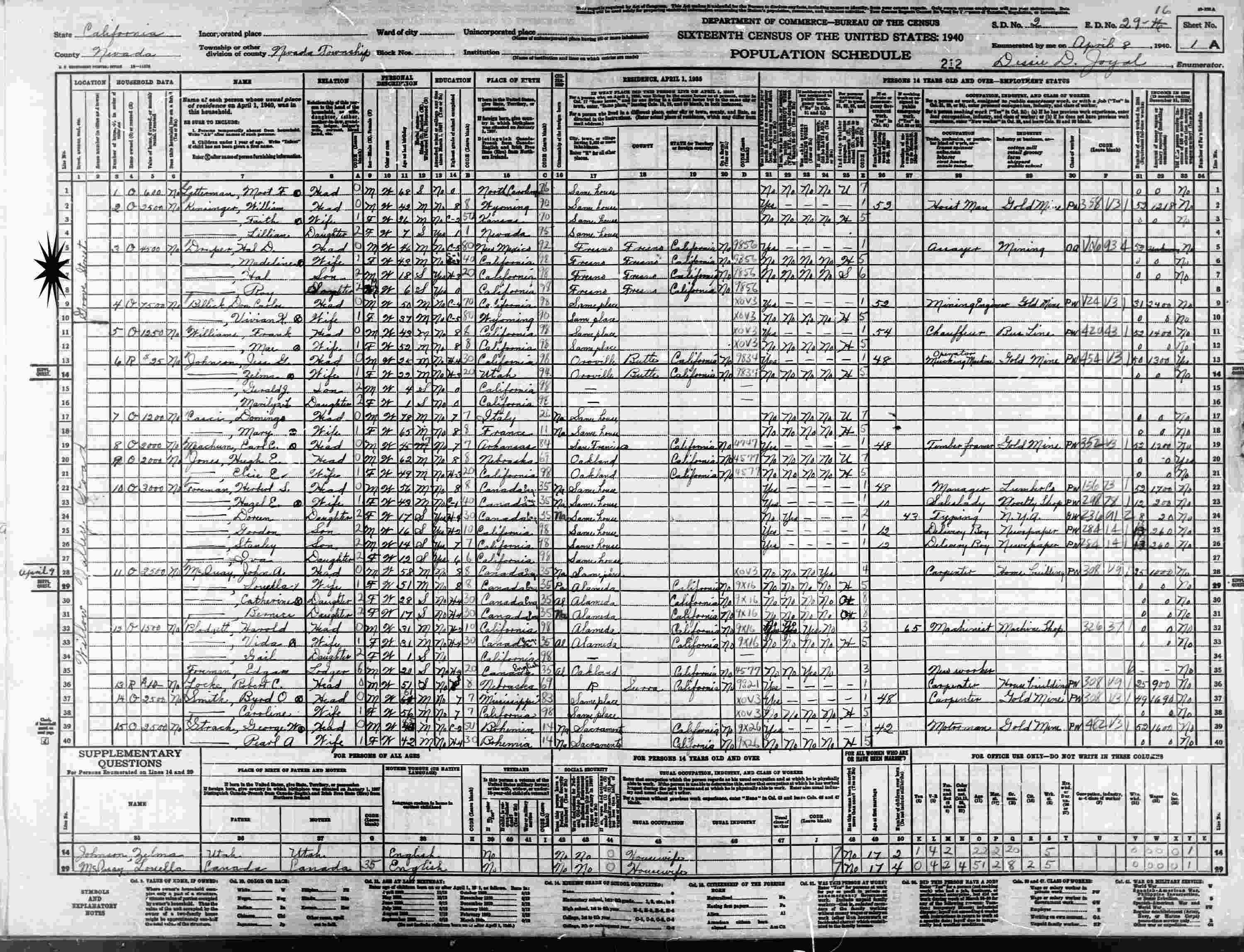 April 8, 1940 - Grove Street, Supervisor's District 2, Enumeration District 29-16, Nevada Township, Nevada County, California.