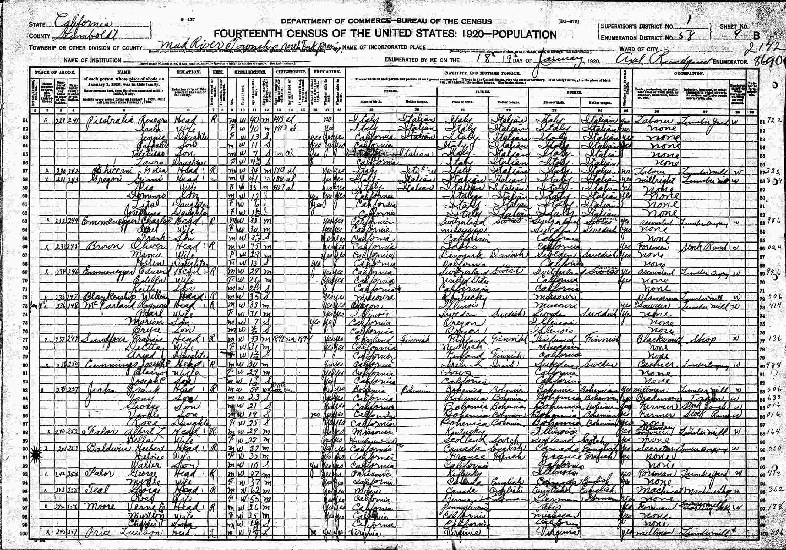 January 18-19, 1920 - Mad River Township, North Fork Precinct, Supervisor's District 1, Enumeration District 58, Humboldt County, California.