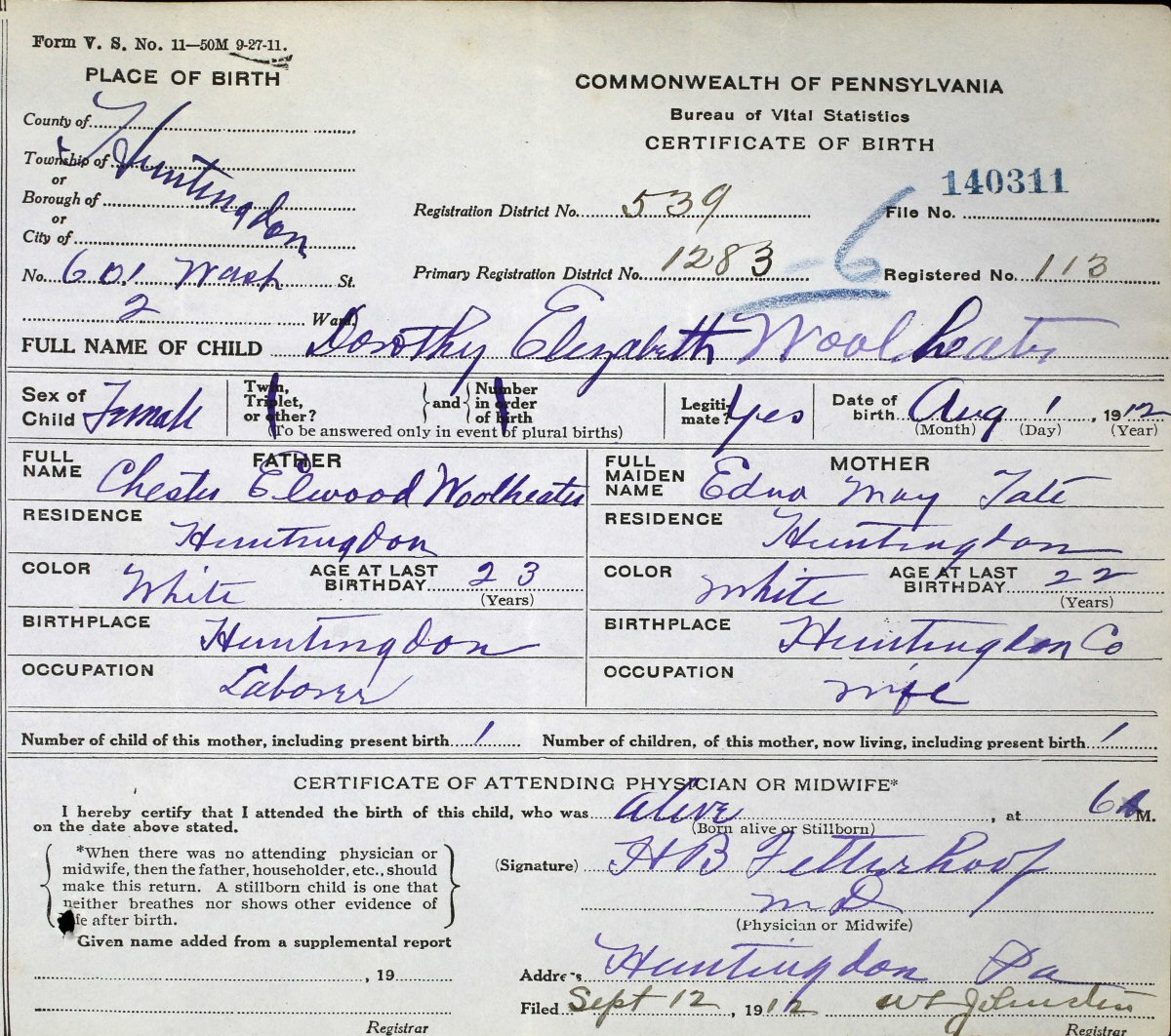 Born: August 1, 1912 in Huntingdon, Huntingdon County, Pennsylvania.