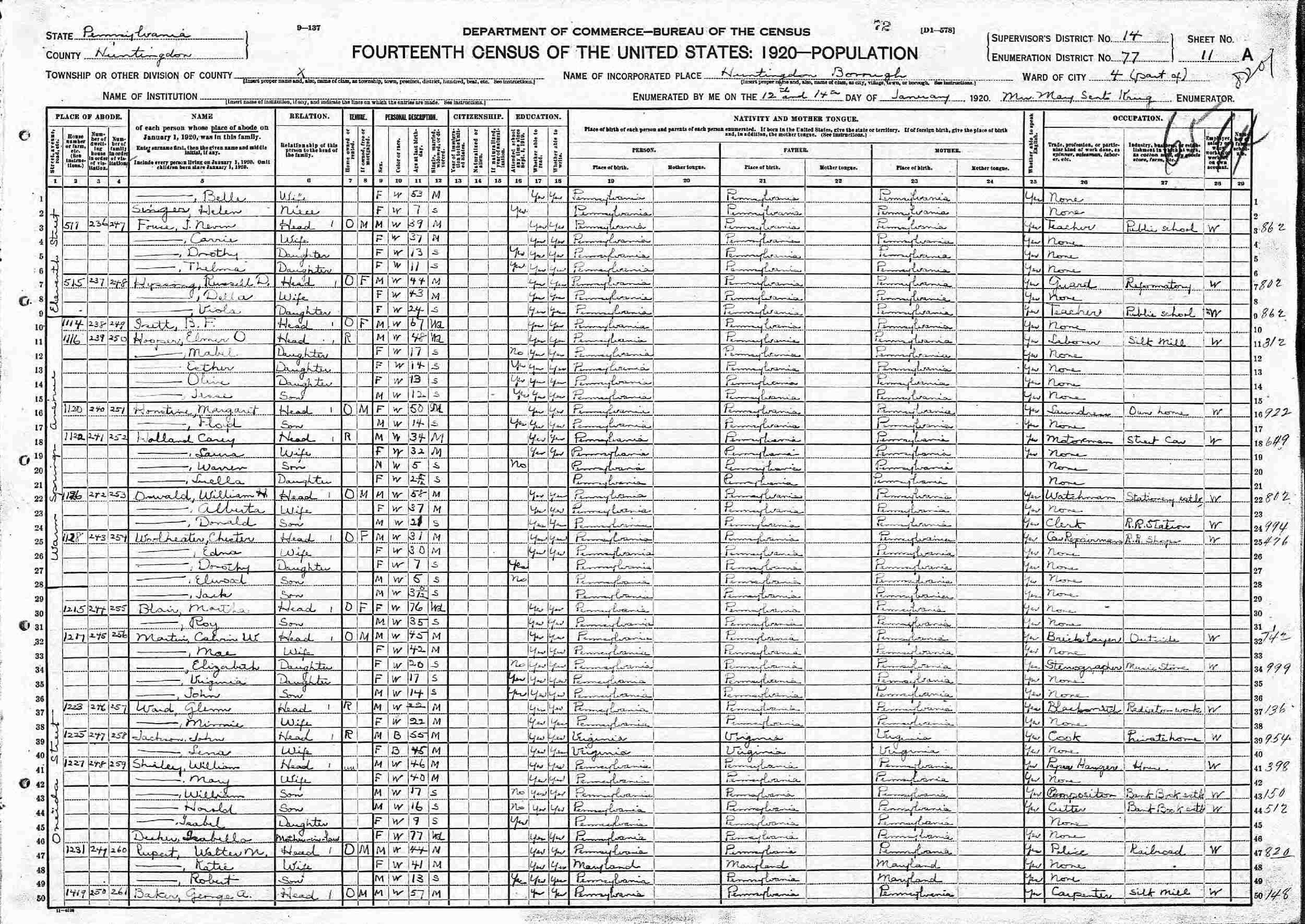 January 12-14, 1920 - 1128 Warm Springs Avenue, Ward 4, Supervisor's District 14, Enumeration District 77, Huntingdon, Huntingdon County, Pennsylvania.