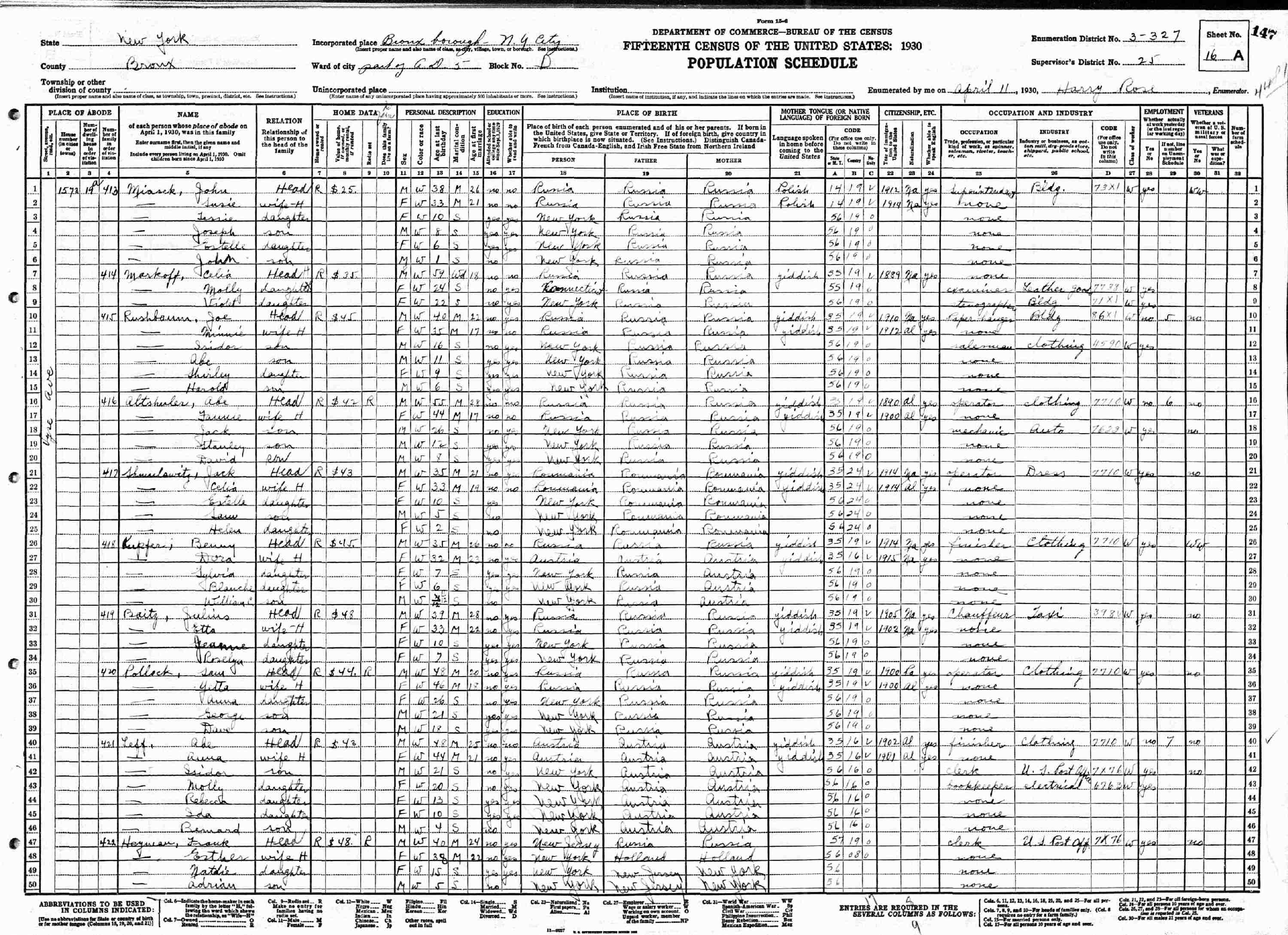 April 1, 1930 - 1573 Syse Avenue, Assembly District 5, Block B, Supervisor's District 25, Enumeration District 3-327, Bronx, New York.