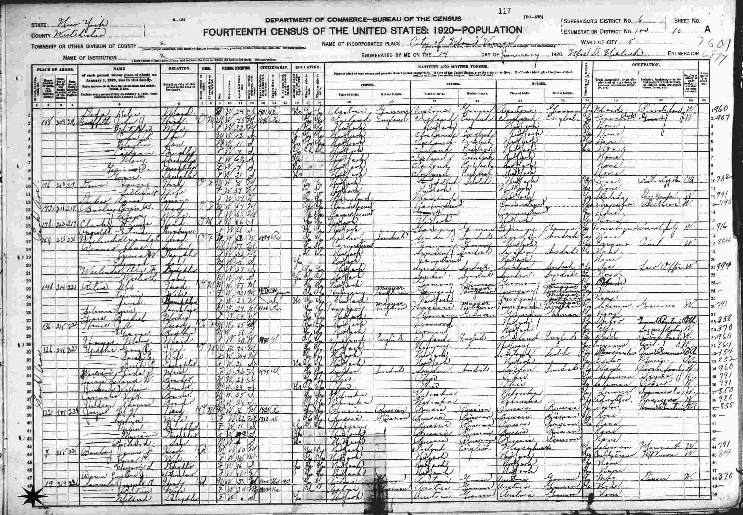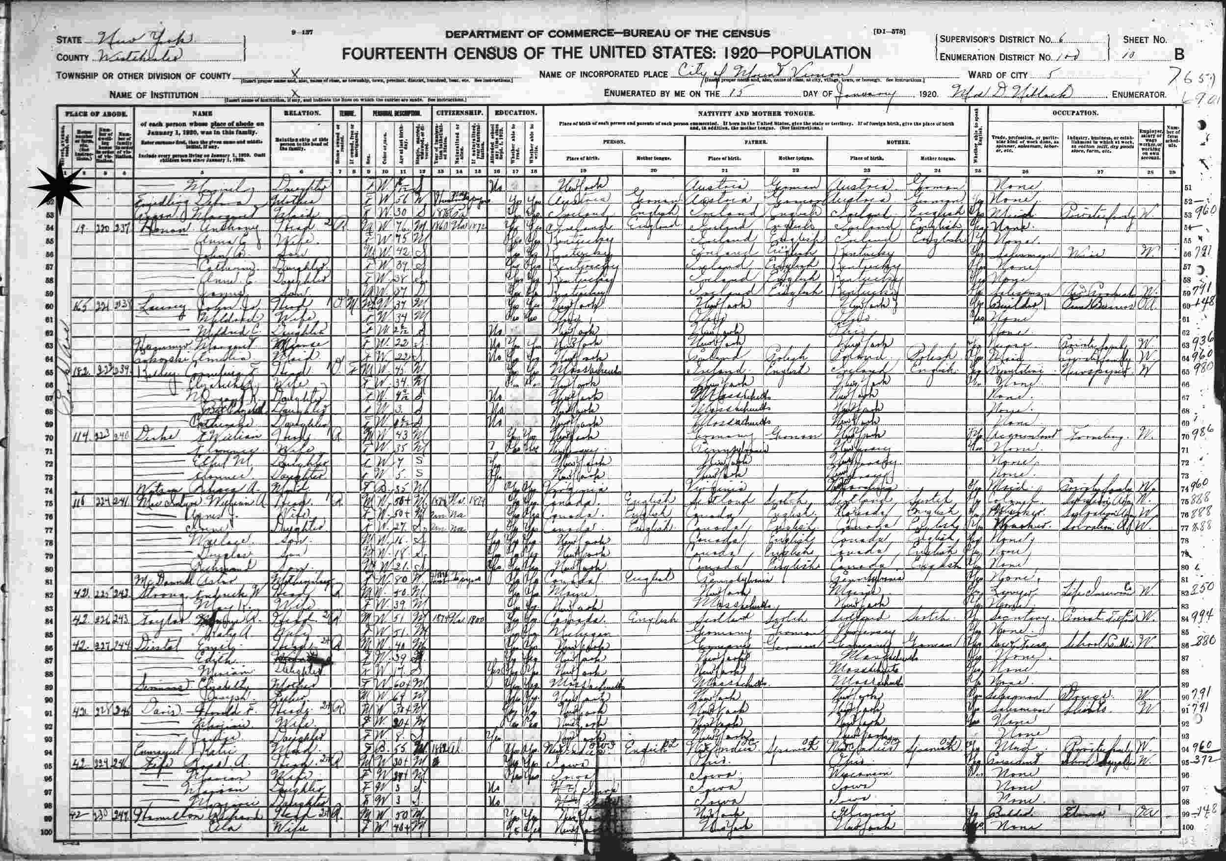 January 14, 1920 - 19 Cook Avenue, Ward 5, Supervisor's District 6, Enumeration District 100, Mount Vernon, Westchester County, New York.