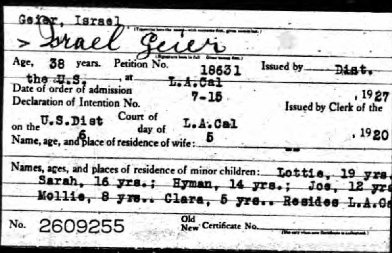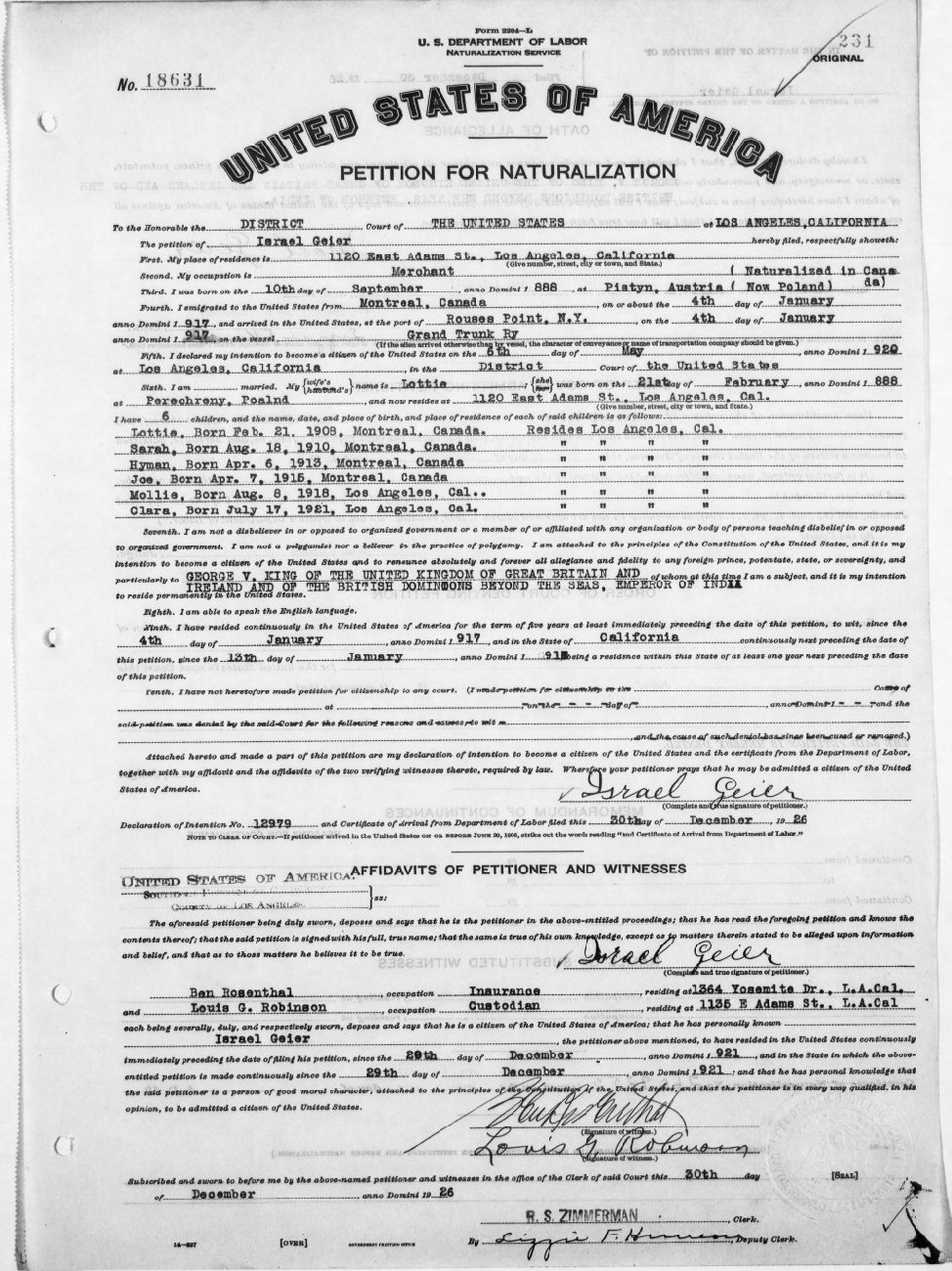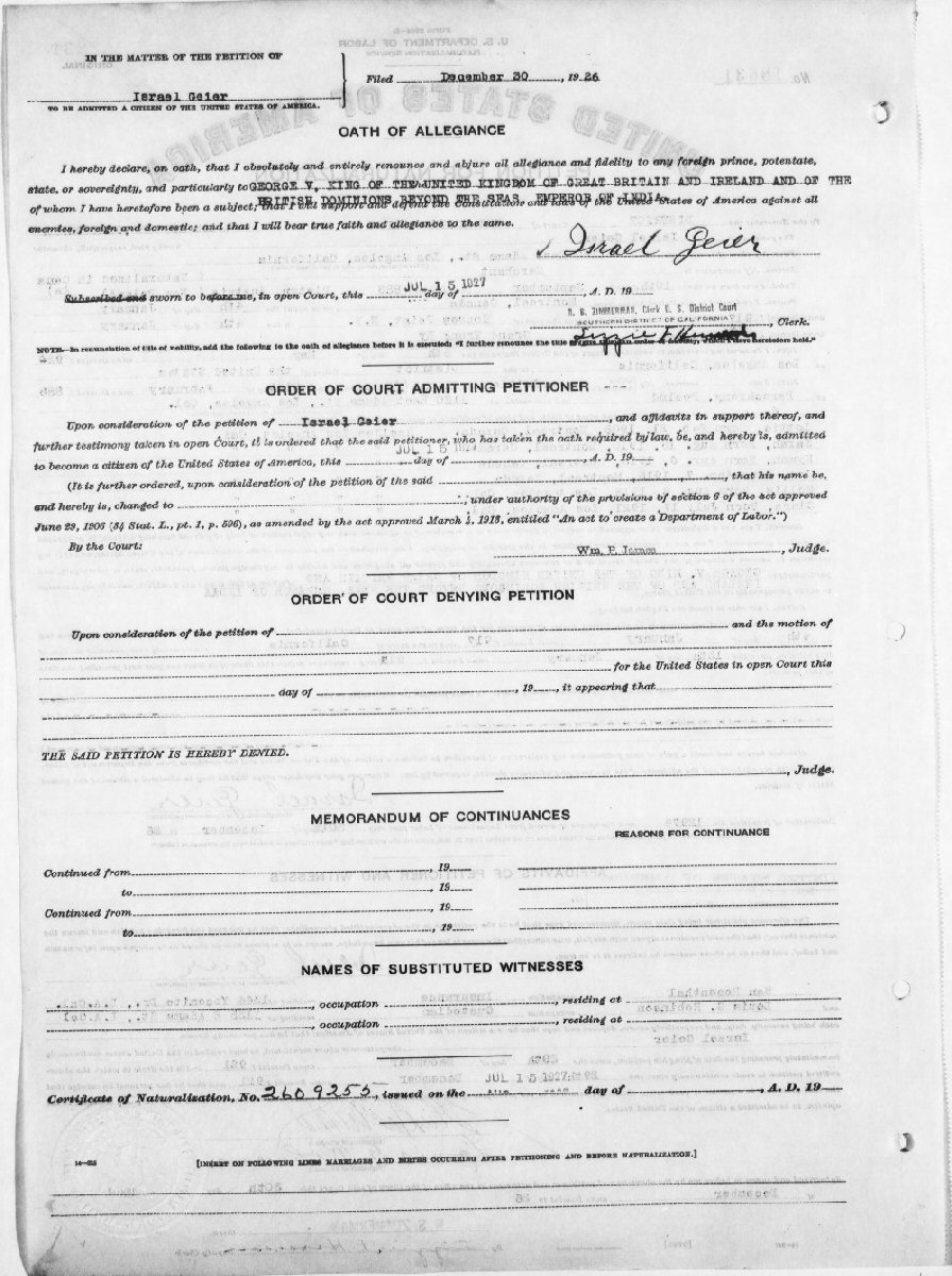 Naturalization: December 30, 1926 #18631 Los Angeles, California.