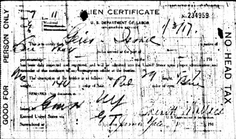 Immigration: From Montreal to Rouses Point, New York - January 4, 1917.