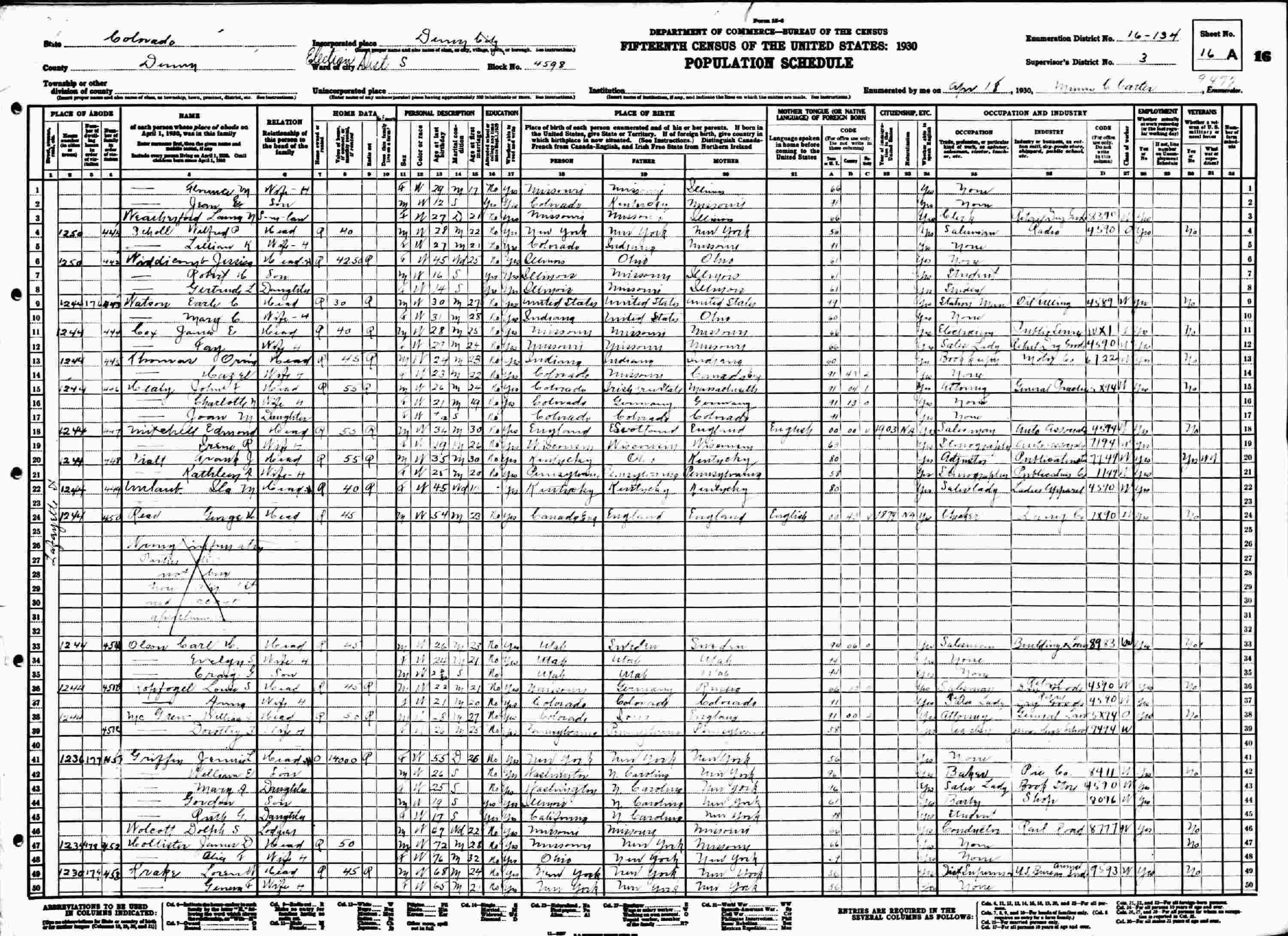 April 18, 1930 - 1244 Lafayette Street, Election District S; Block: 4598, Supervisor's District 3, Enumeration District 16-134, Denver, Denver County, Colorado.