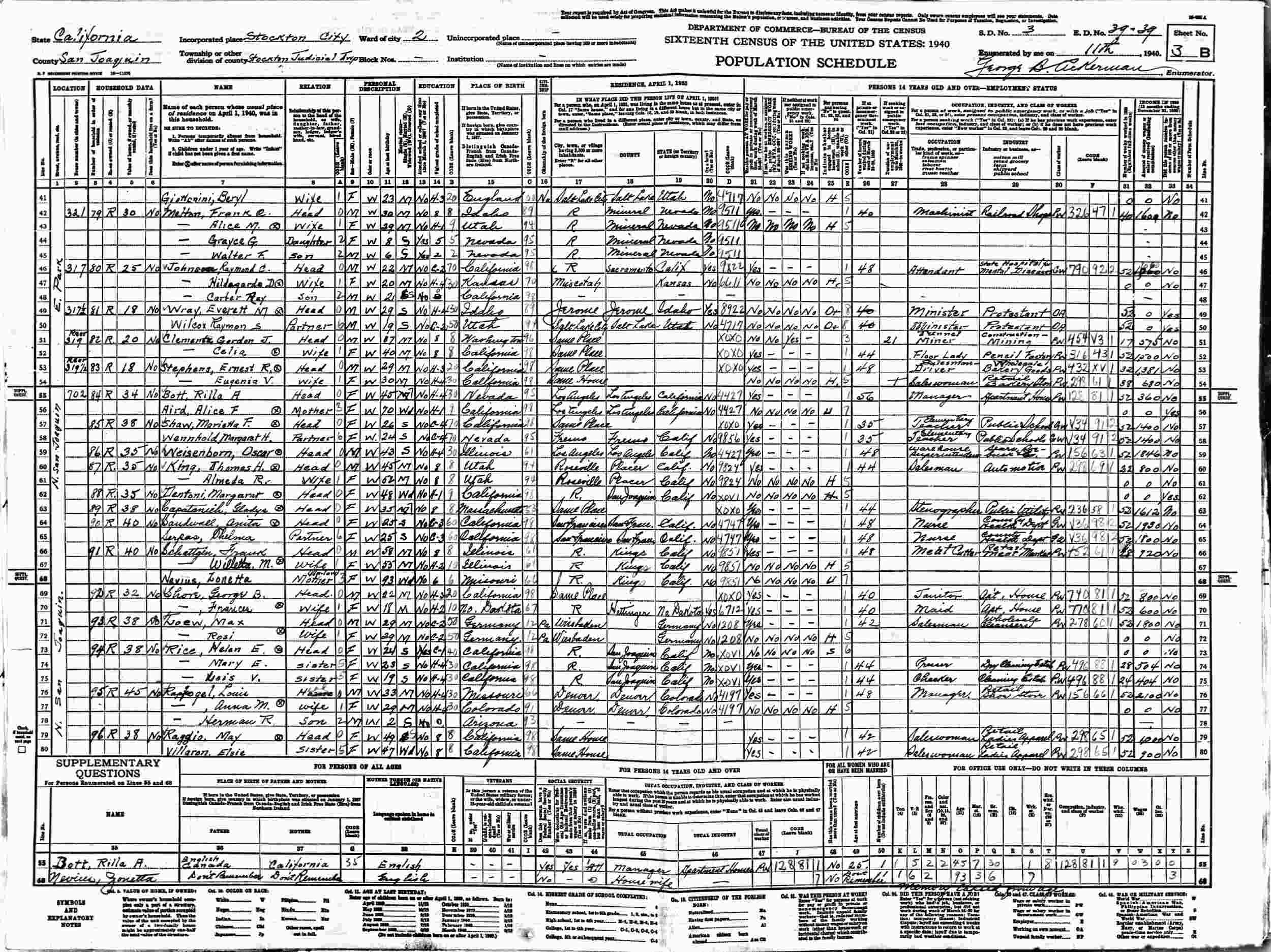 1940 - N. San Joaquin, Ward 2, Supervisor's District 3, Enumeration District 39-39, Stockton Jidicial Township, Stockton City, San Joaquin, California.