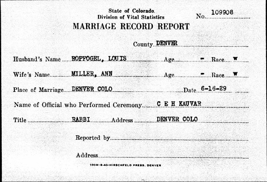 Married Louis S Ropfogel June 16, 1929 in Denver, Denver County, Colorado.