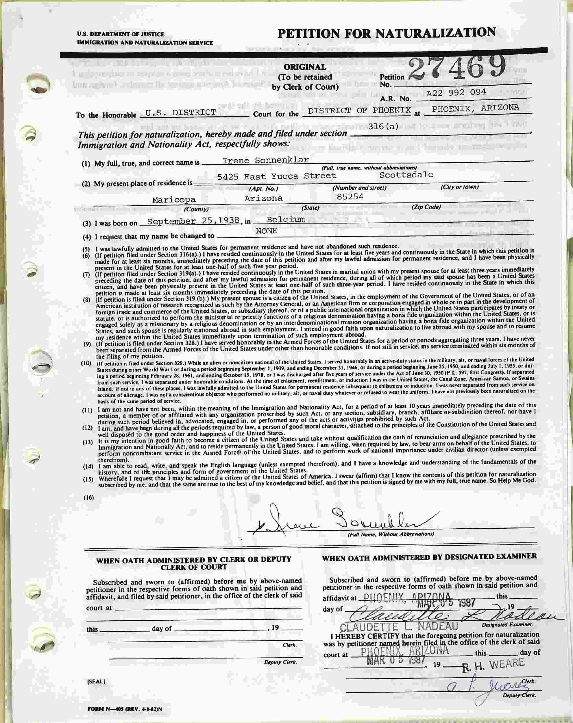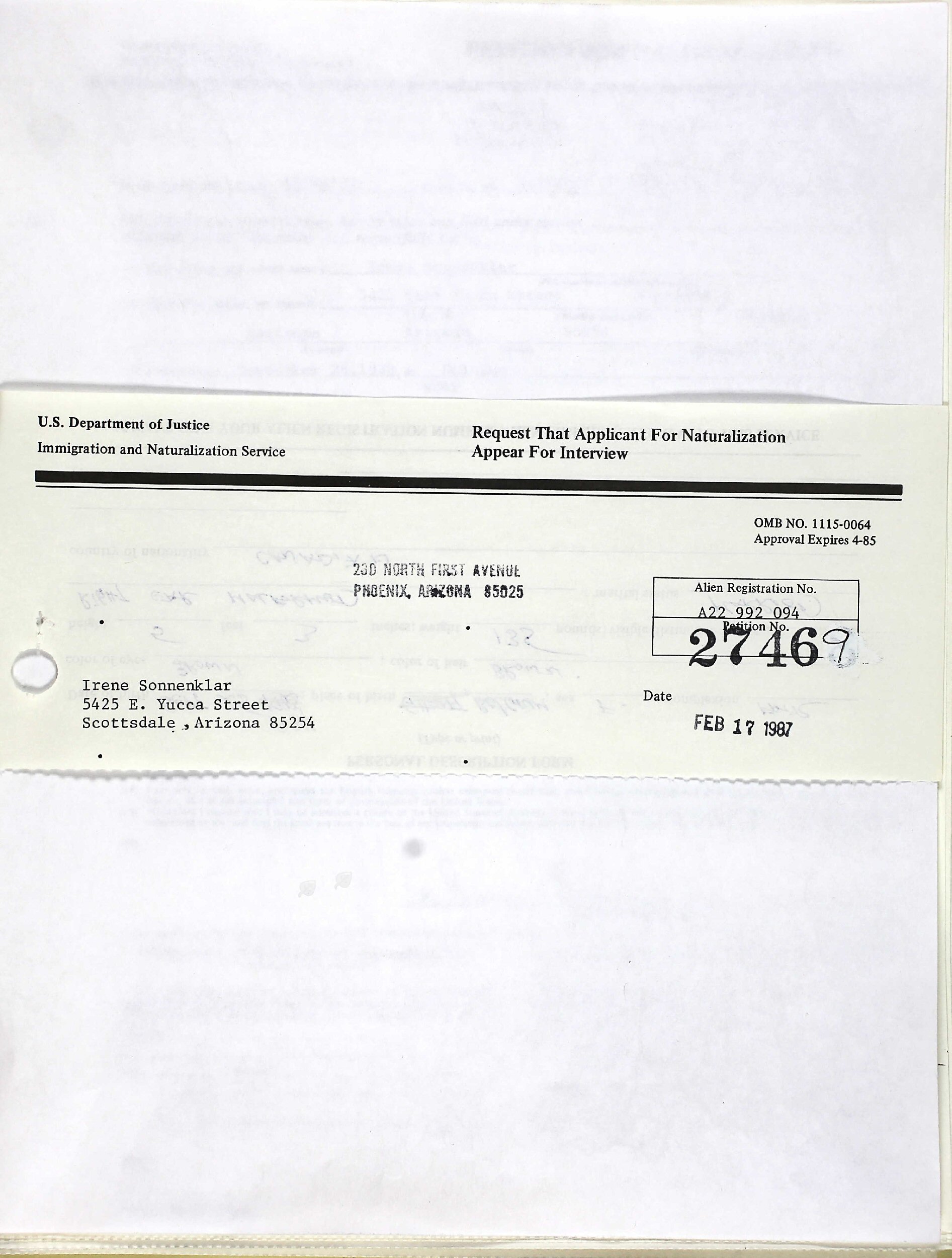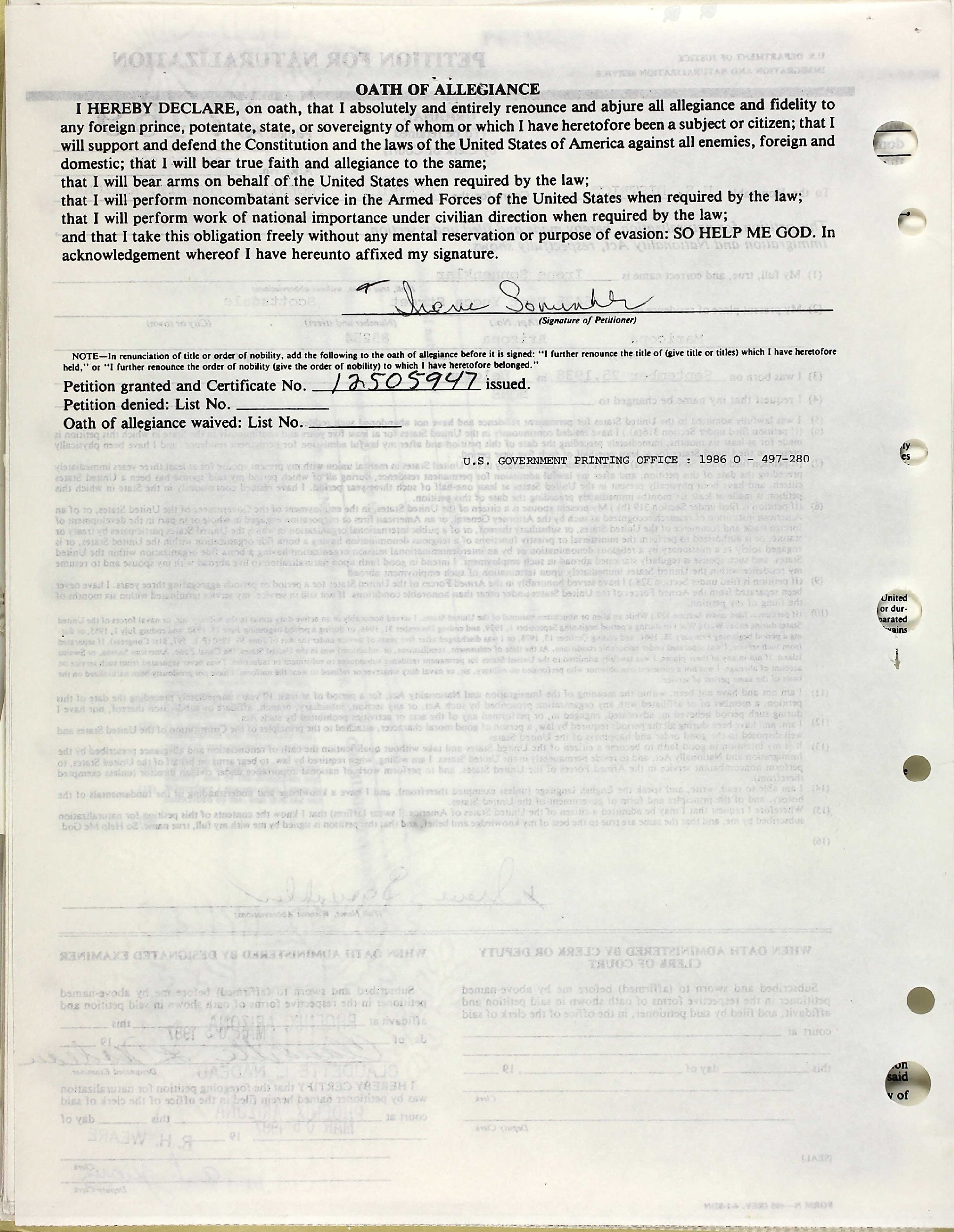 Oath of Allegiance: March 5, 1987 - Phoenix, Maricopa County, Arizona.