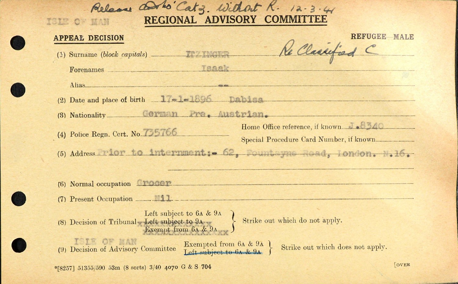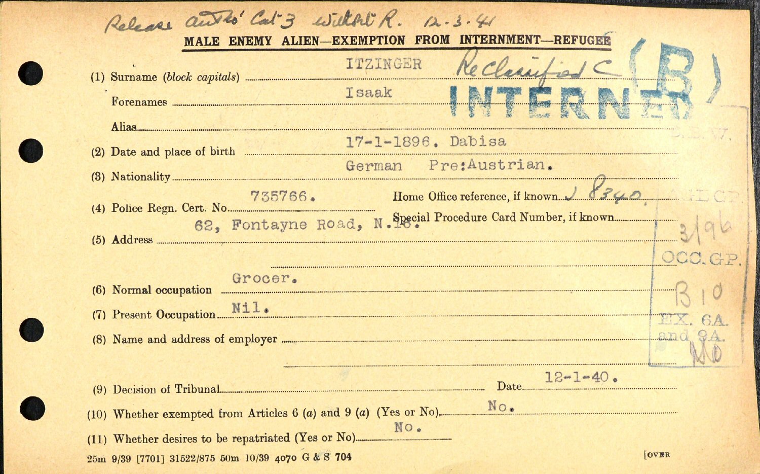 Residence Before Internment: 62 Fountayne Road, London, England.
