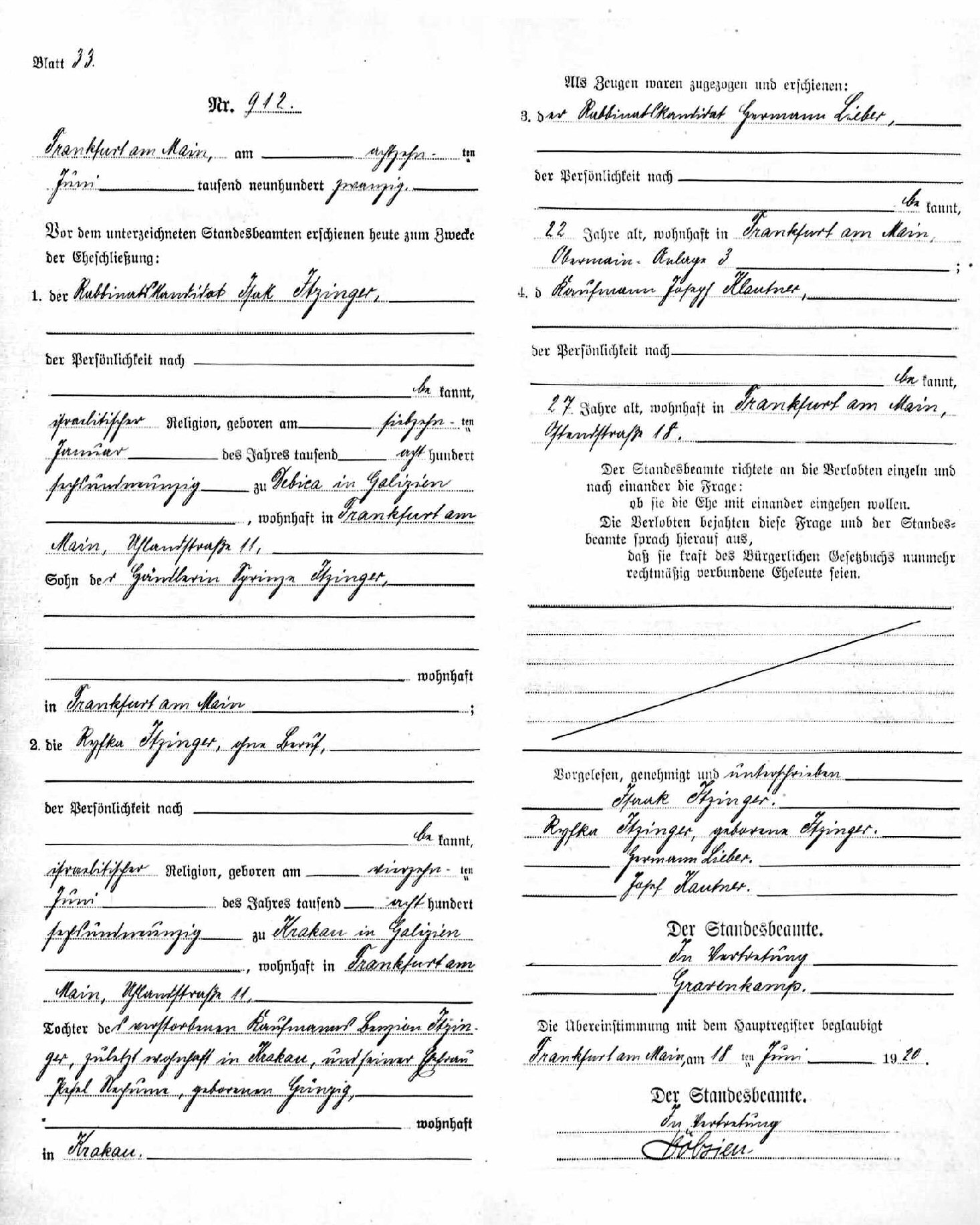 Married: Ryska Itzinger June 18, 1920 in Frankfurt am Main, Hessen (Hesse), Germany.