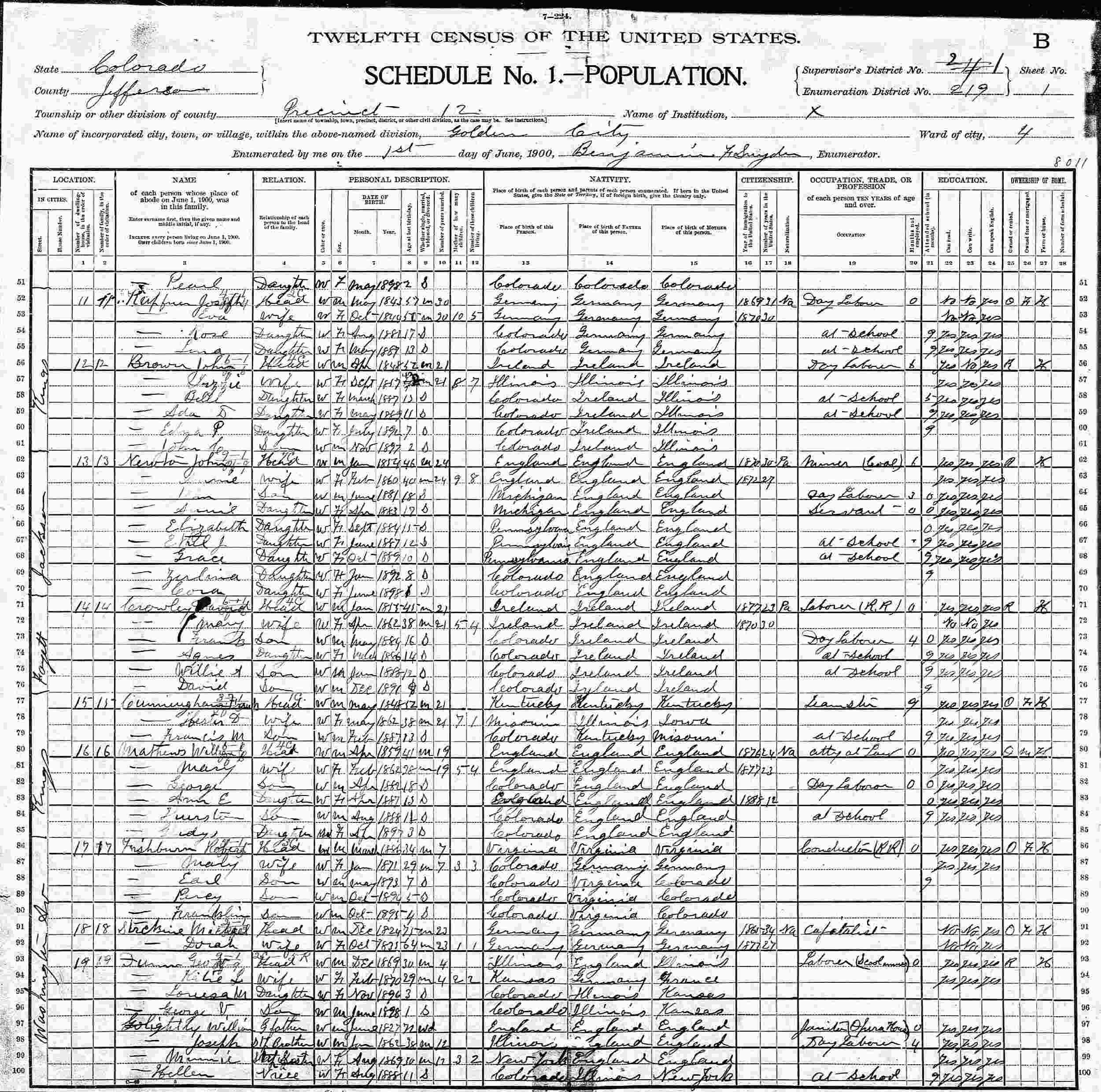June 1, 1900 - Washington Street, Precint 12, Supervisor's Distrcit 2 (crossed out to 1), Enumeration District 219, Golden, Jefferson County, Colorado.