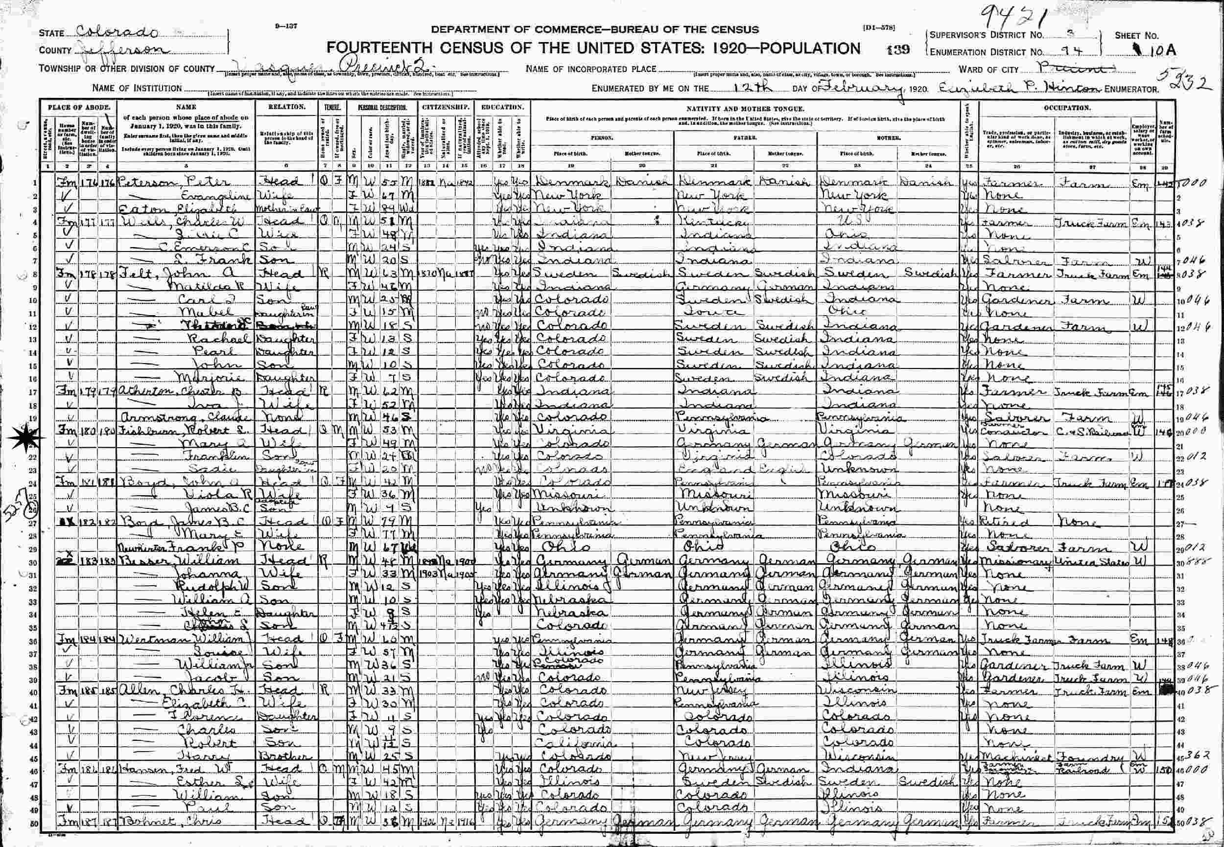 February 12, 1920 - Vasquez Precinct 2, Supervisor's District 3, Enumeration District 94, Jefferson County, Colorado (w/parents).