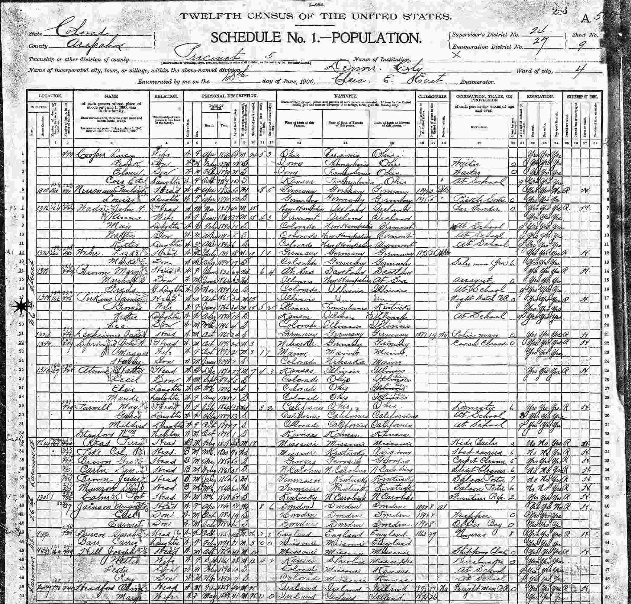 June 12, 1900 - 1372 25th Street, Precinct 5, Supervisor's District 24, Enumeration District 27, Denver, Arapahoe County, Colorado.