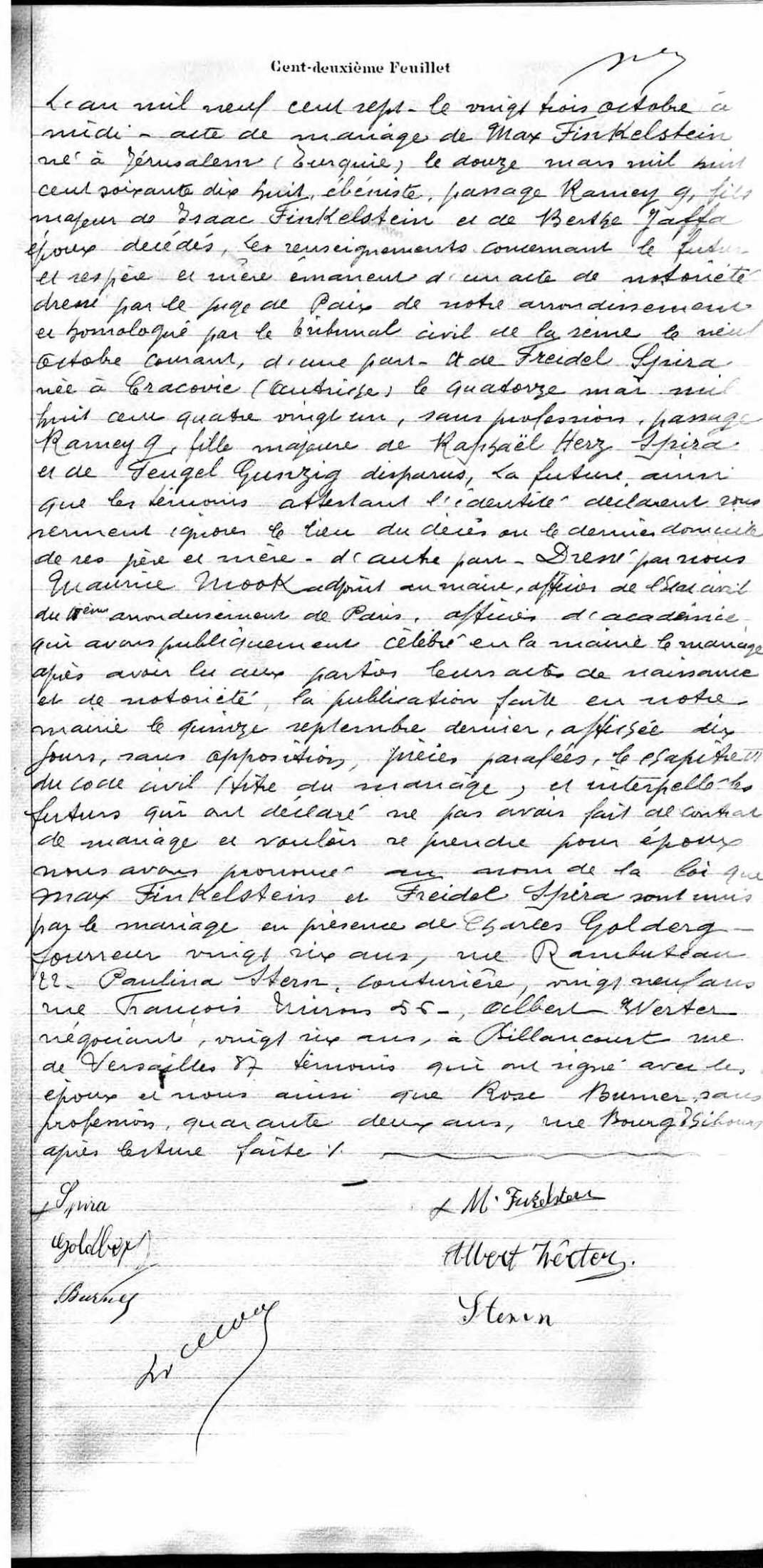 Notes for MAX FINKELSTEIN: Son of Isaac and Berthe (Jaffa) Finkelstein. Born: March 12, 1878 in Jerusalem, Israel. Died: July 10, 1929 in Dixieme Arrondissemnt De Paris, France. Married: Freidel Spira October 23, 1907 in Paris, France.