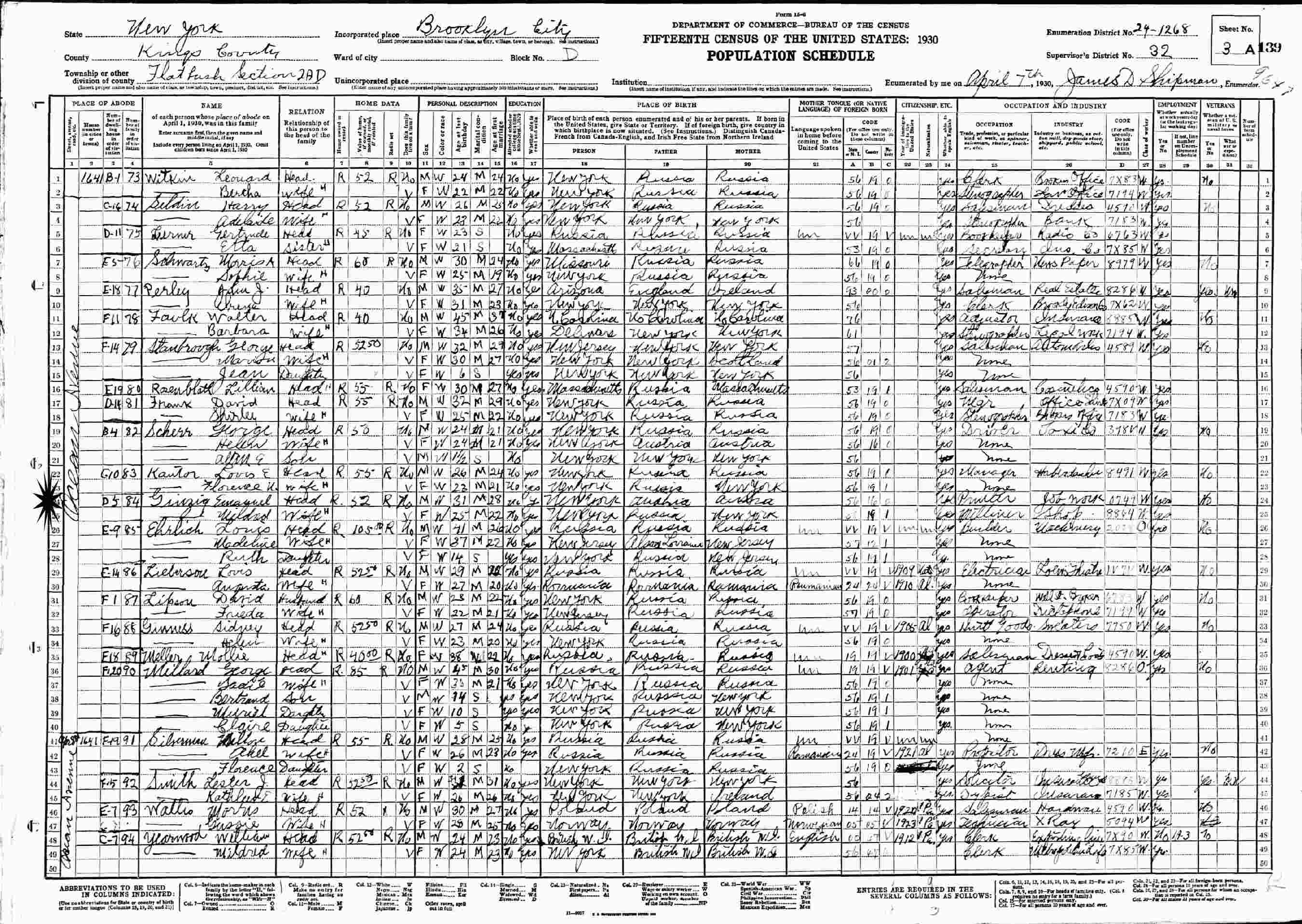 April 7, 1930 - 1641 Ocean Avenue, Flatbush Section 2 Assembly District, Enumeration District 24-1268, Supervisor's District 32, Brooklyn, Kings County, New York.