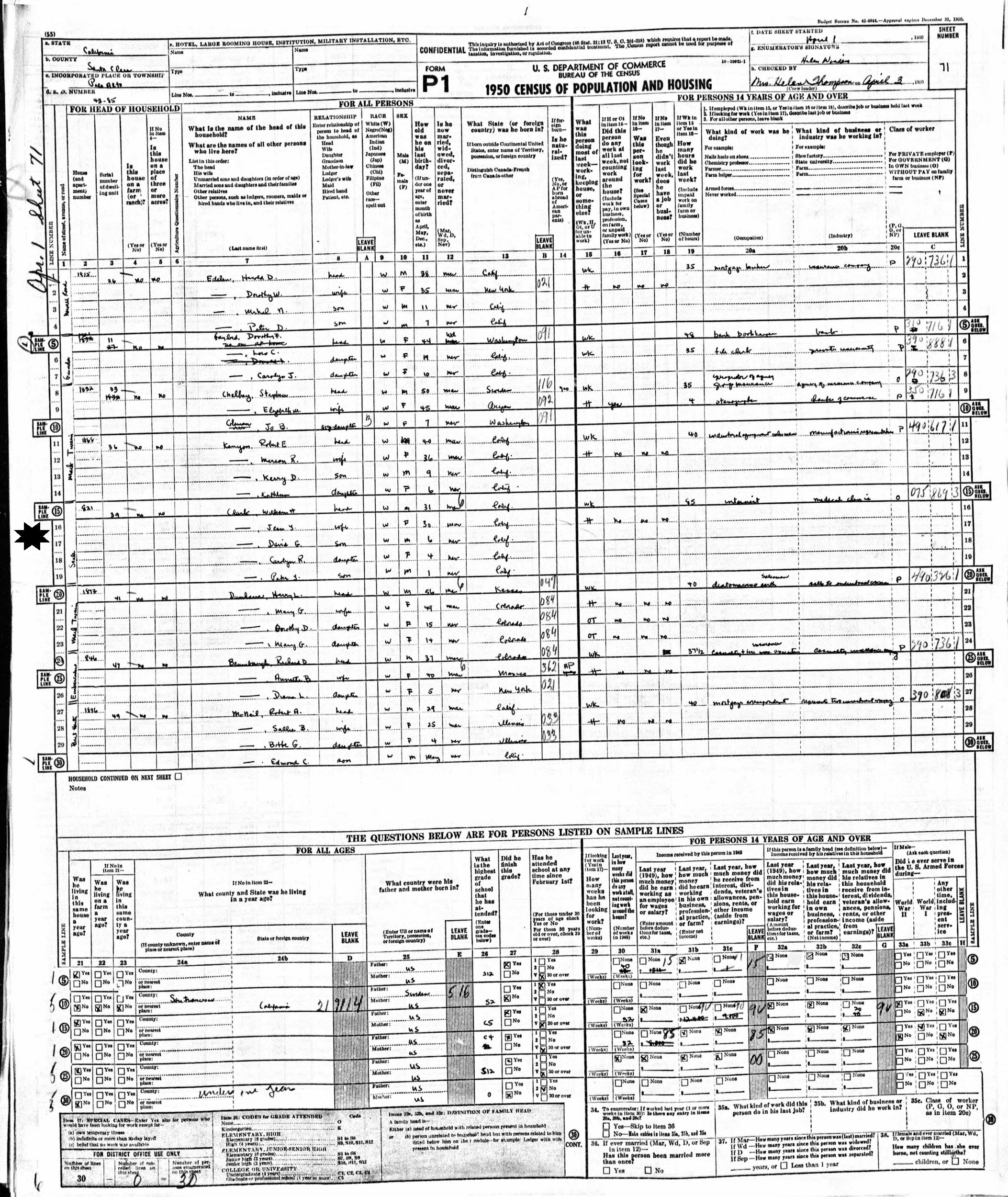 April 1, 1950 - 821 Seale, Enumeration District 43-85, Palo Alto, Santa Clara County, California.