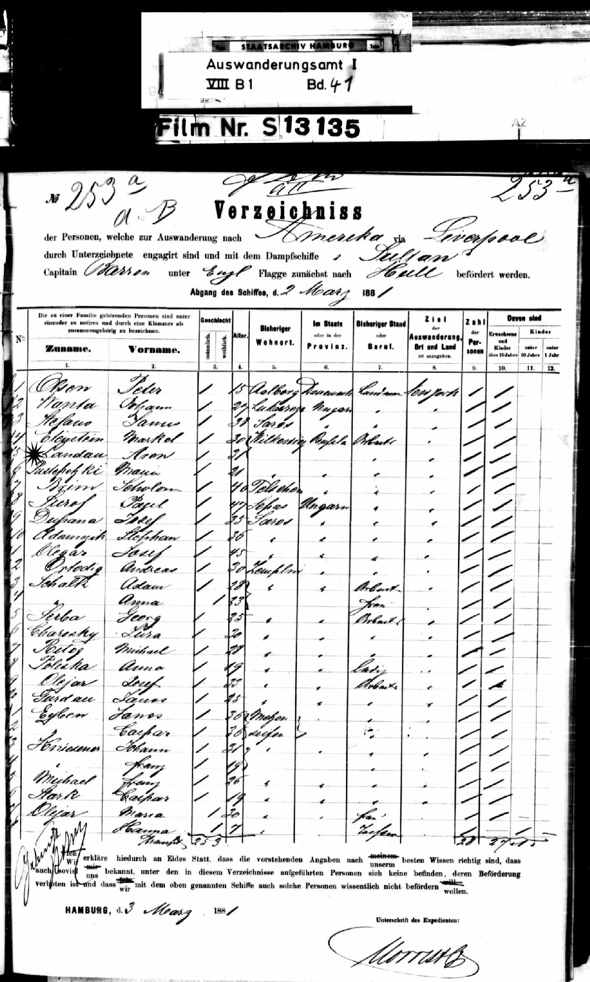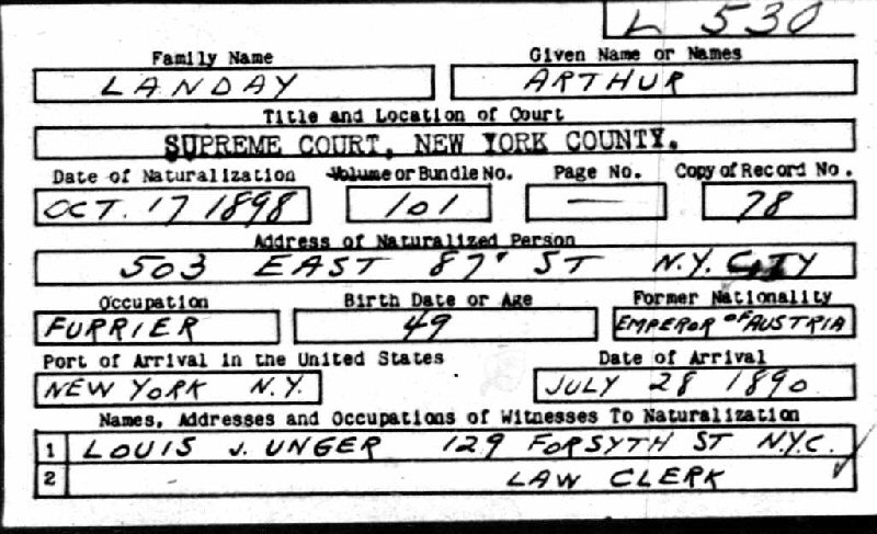 Last Name: Spelled as Landan on New York, Passenger Lists, 1820-1957 index and Landay on Naturalization Card.