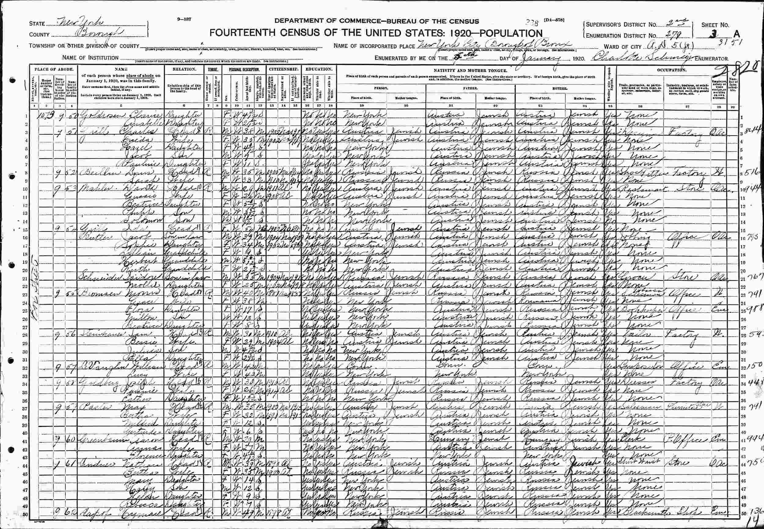 January 5, 1920 - 1073 Fox Street, Assembly District 5, Supervisor's District 2, Enumeration District 279, Bronx, New York.