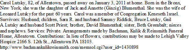 Died: January 03, 2011 in Allentown, Lehigh County, Pennsylvania.