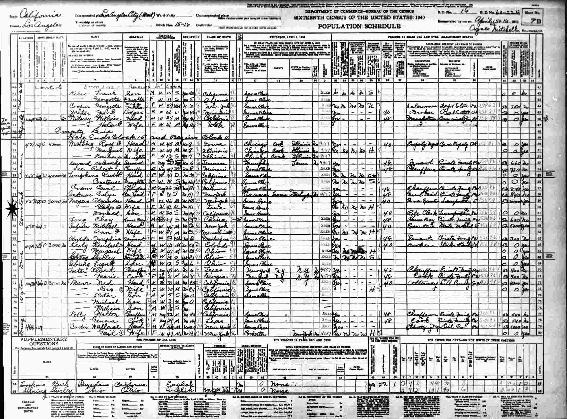 April 15-16, 1940 - 459 Comstock Avenue, Blocks 15-16, Supervisor's District 16, Enumeration District 60-221A, Los Angeles, Los Angeles County, California.