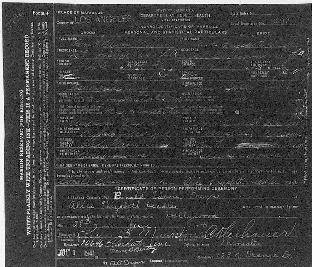 Married: (1) Alice Elizabeth Headlee June 28, 1941 in Los Angeles, Los Angeles County, California. (Daughter of John Ernest Headlee and Edith P Leigh also found as Headloe. Son: Ronald "Ron" Edwin.)