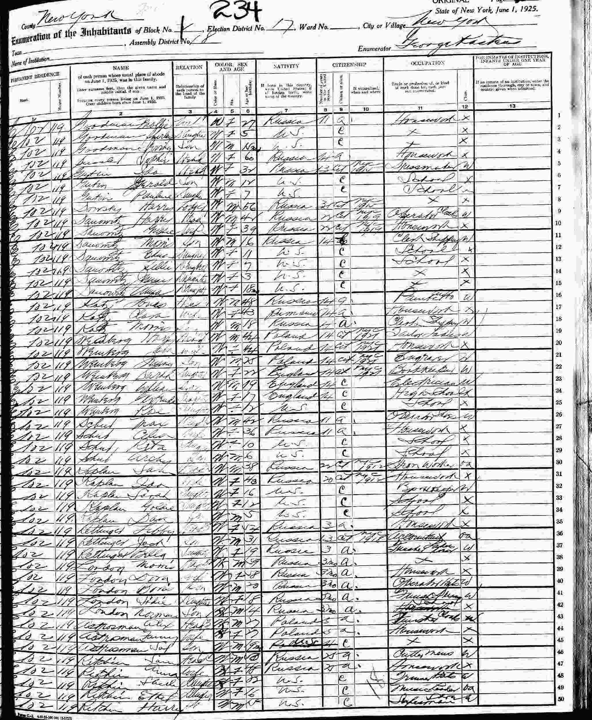 June 1, 1925 - New York State - 119 E 102nd, Block 1, Election District 17, Assembly District 18, New York City, New York.