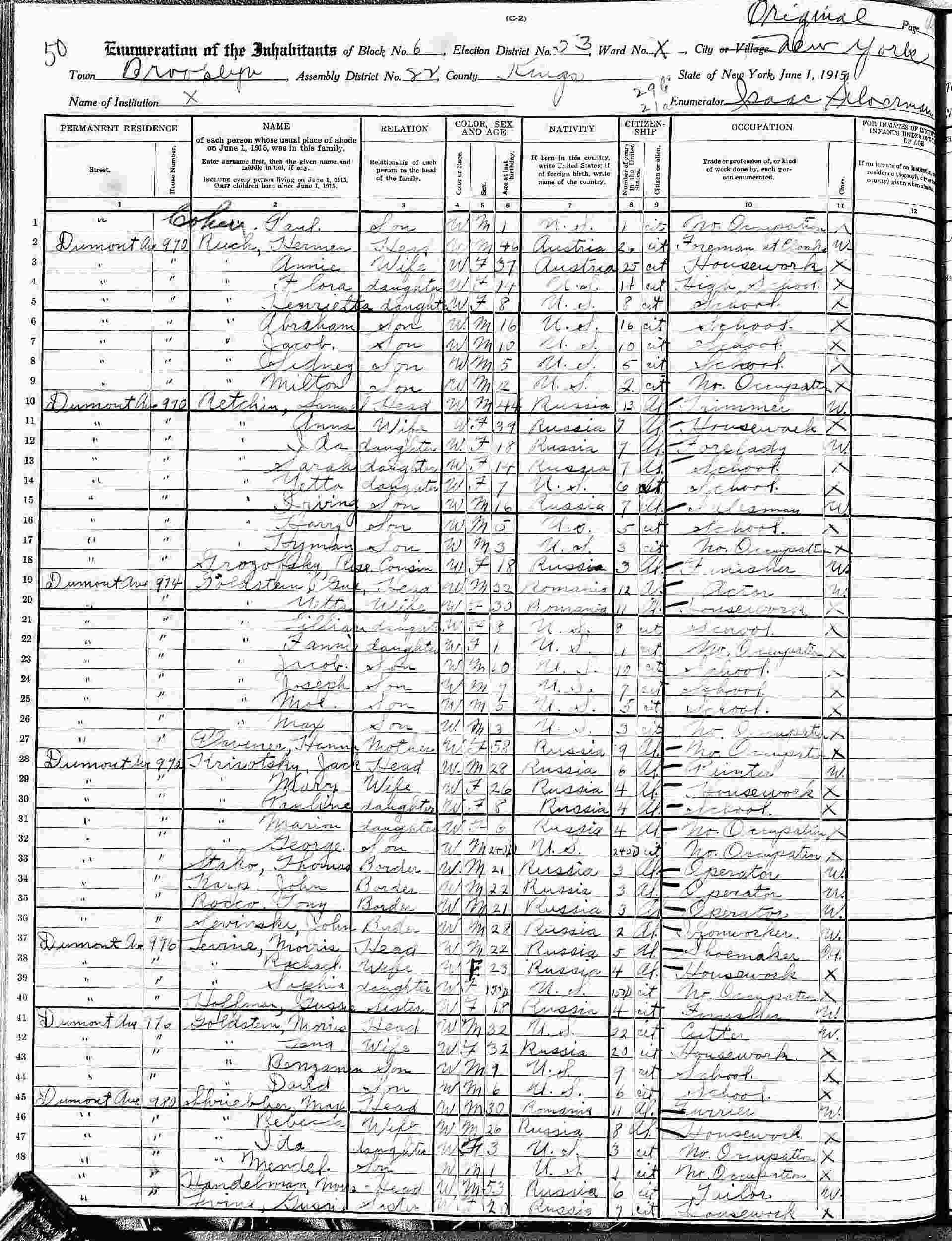 June 1, 1915 - New York State - 970 Dumont Avenue, Block 6, Election District 53, Assembly District 82, Brooklyn, Kings County, New York.