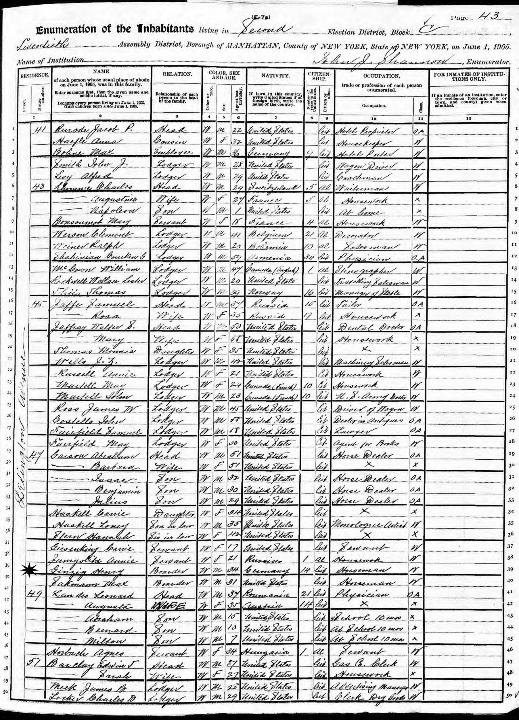 June 1, 1905 - New York State - 47 Lelington Avenue, Assembly District 20, Election District 2, Block C, Manhattan, New York.