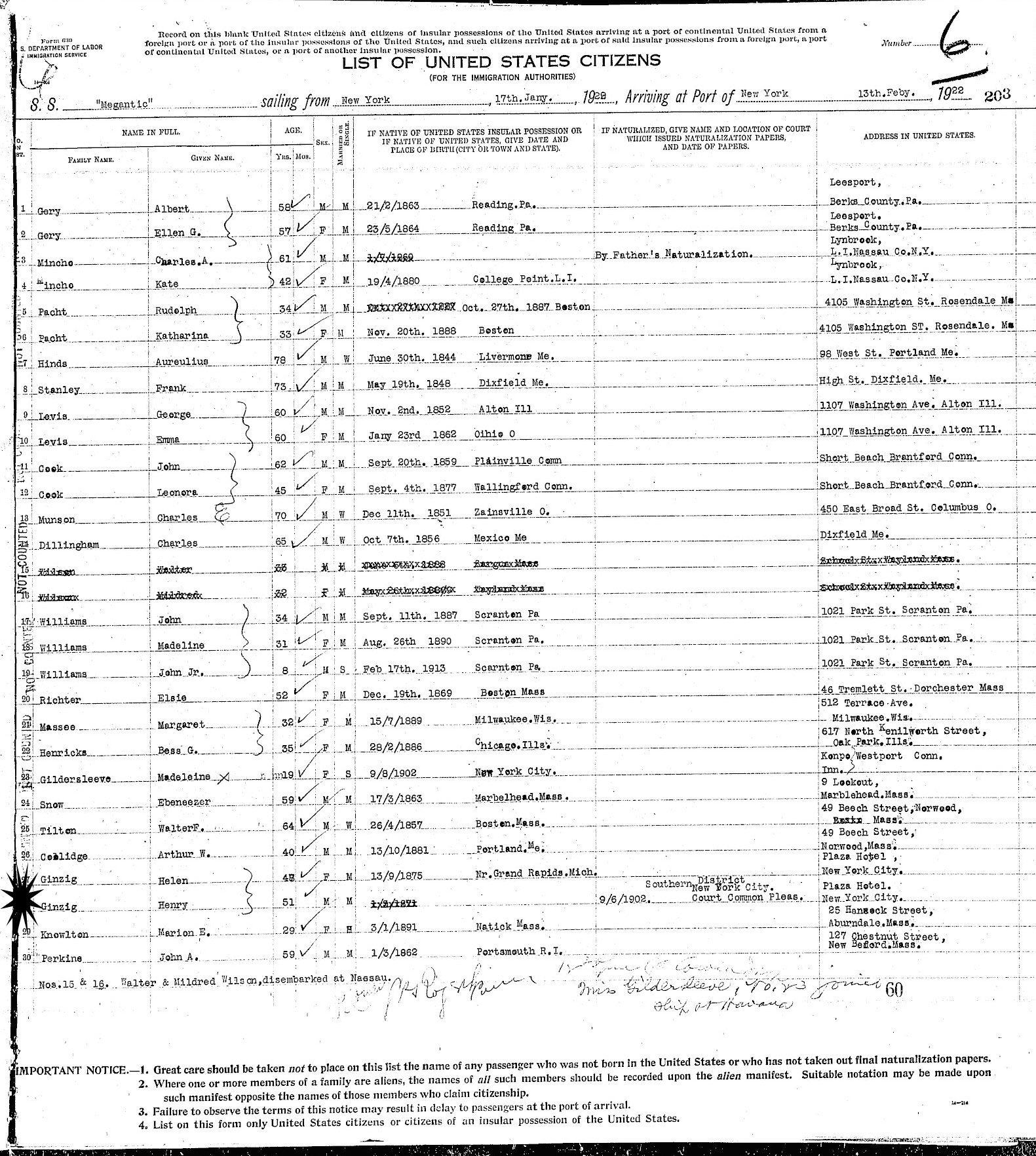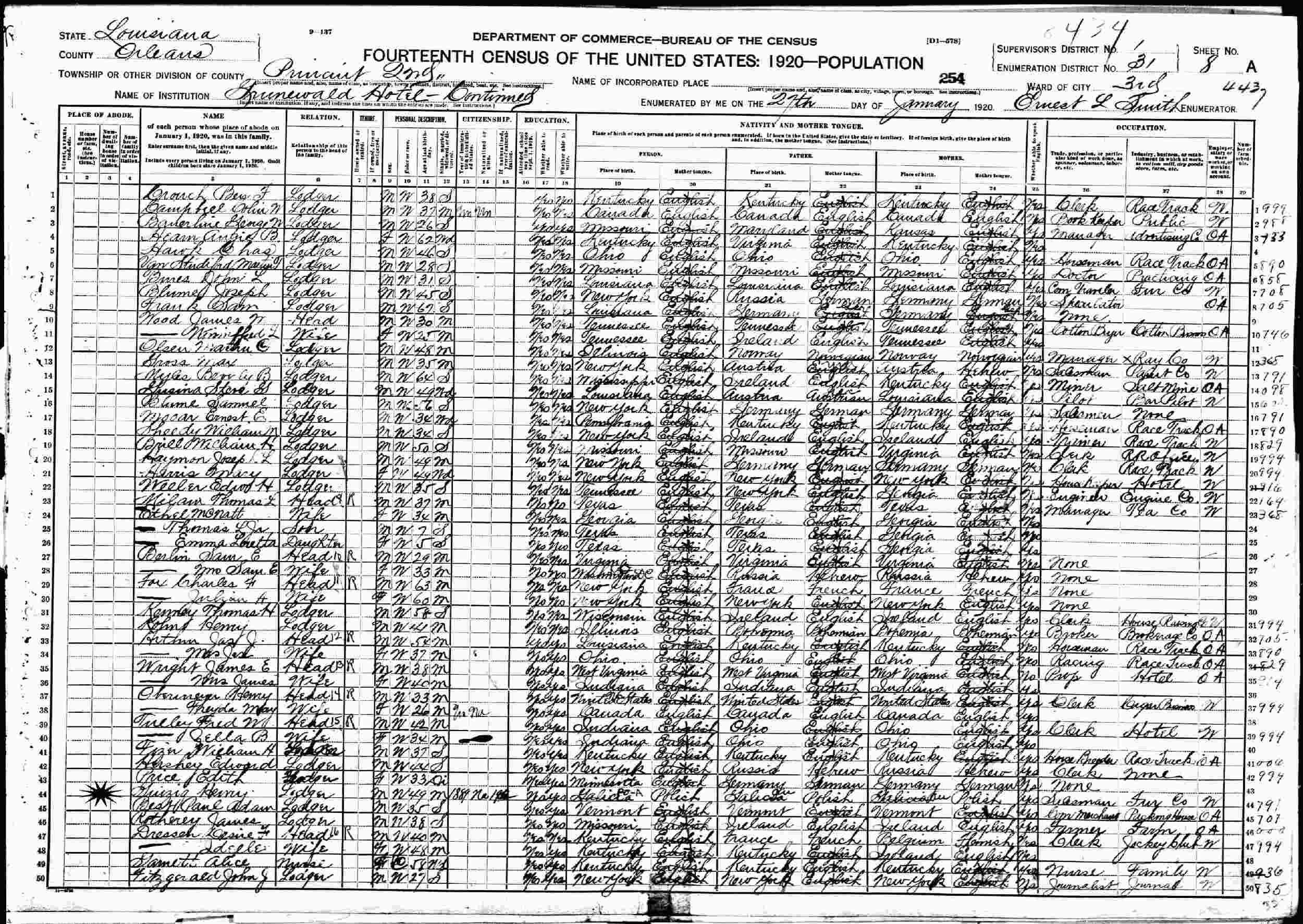 January 27, 1920 - lodger at Grunewald Hotel, Precinct 2, Ward 3, Supervisor's District 1, Enumeration District 31, New Orleans, Orleans, Louisiana