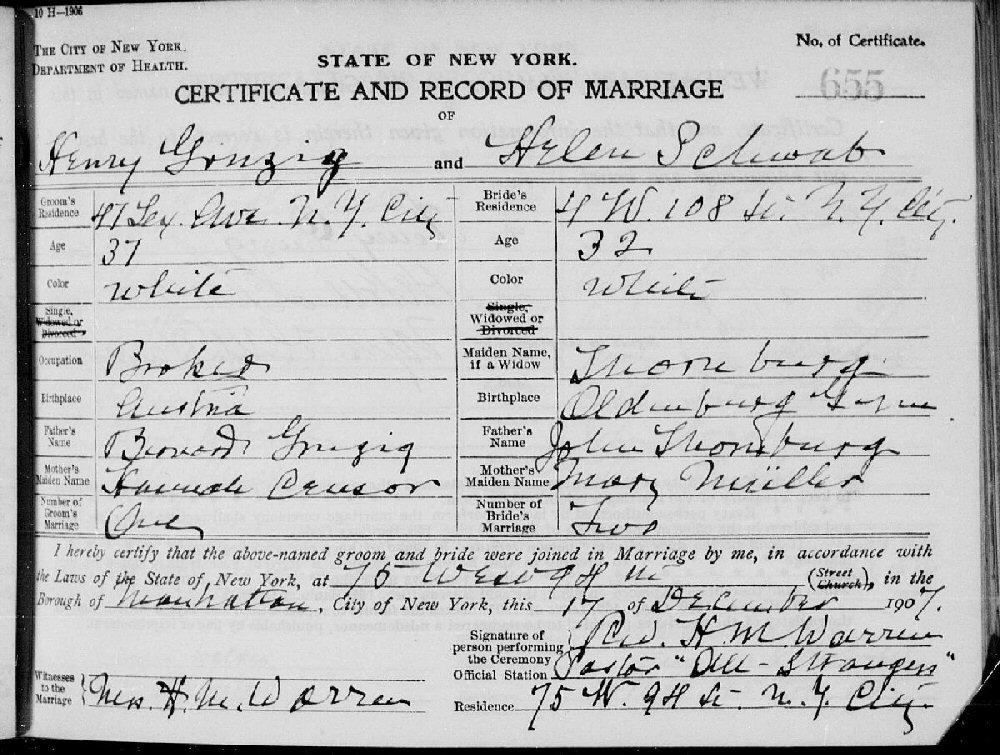 Married: Helen (nee Thorneburg/Thorne) Schwab December 17, 1907 in Manhattan, New York.