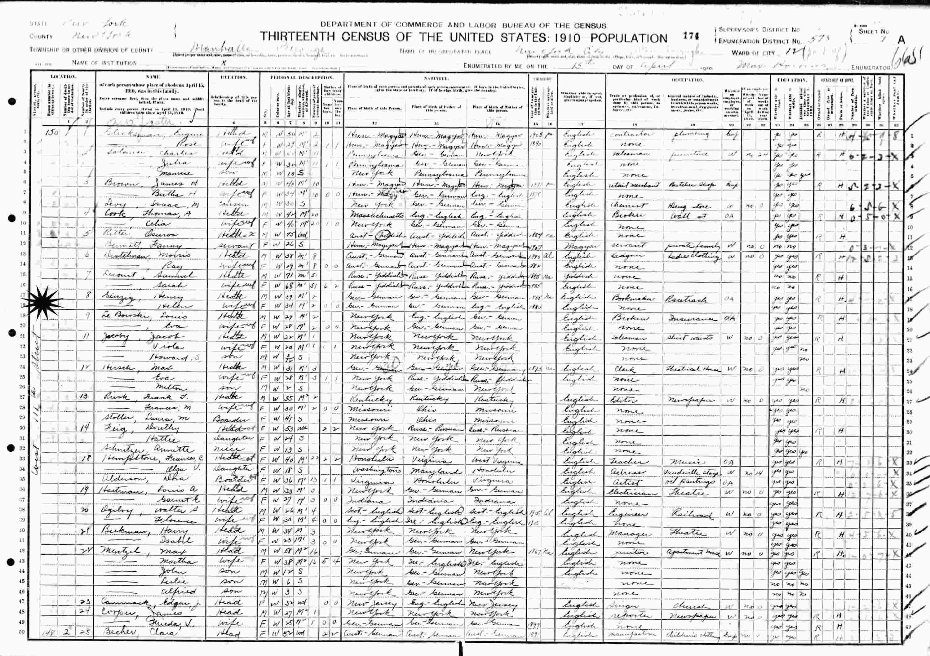 April 15, 1910 - 150 West 11th Street, Manhattan, Supervisor's District 1?, Enumeration District 578, Ward 12, New York, New York.