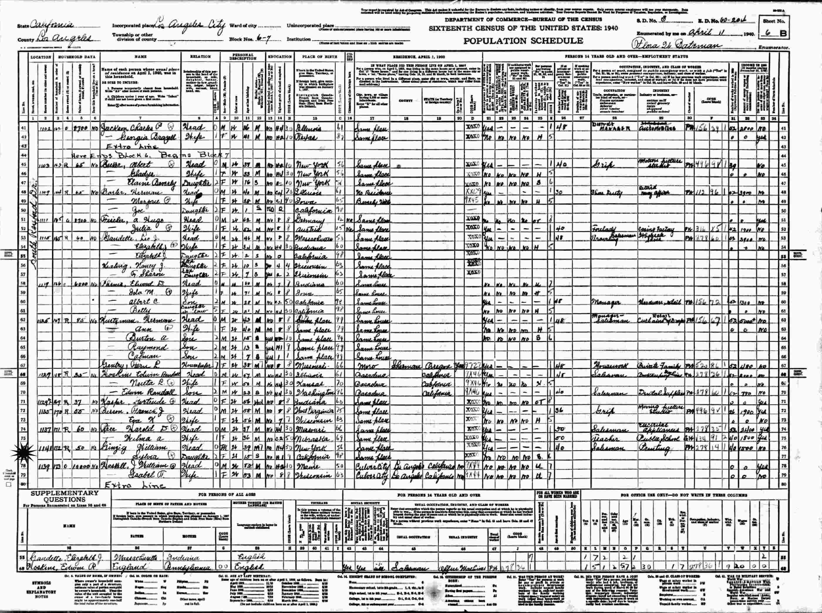 April 11, 1940: 1141 South Rexford Drive, Supervisor's District 3, Enumeration District 60-2016, Blocks Numbers 6-7, Councilmanic District 3, Los Angeles, Los Angeles County, California.