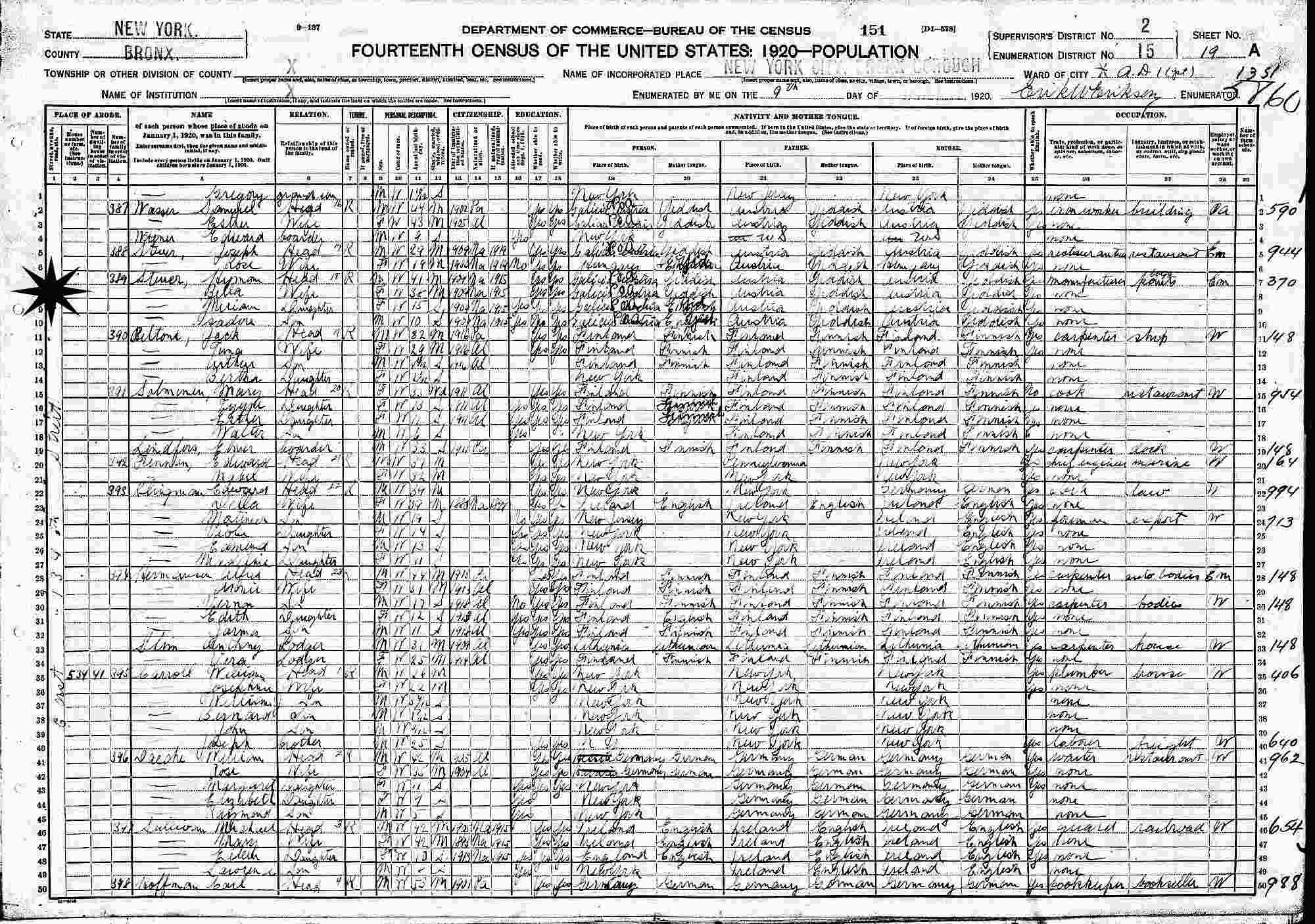 January 9, 1920 - 530 134th Street, Assembly District 1, Supervisor's District 2, Enumeration District 15, Bronx, New York.
