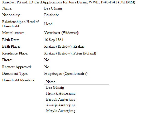 Notes for LEA SPIRA GINZIG: Daughter of Nathan and Malka Feigel (Wecker) Spira. Born: August 16, 1866 in Krakow, Poland. Died: After May 15, 1901 in Unknown. Married: Markus Saul Ginzig March 8, 1894 in Krakow, Poland.