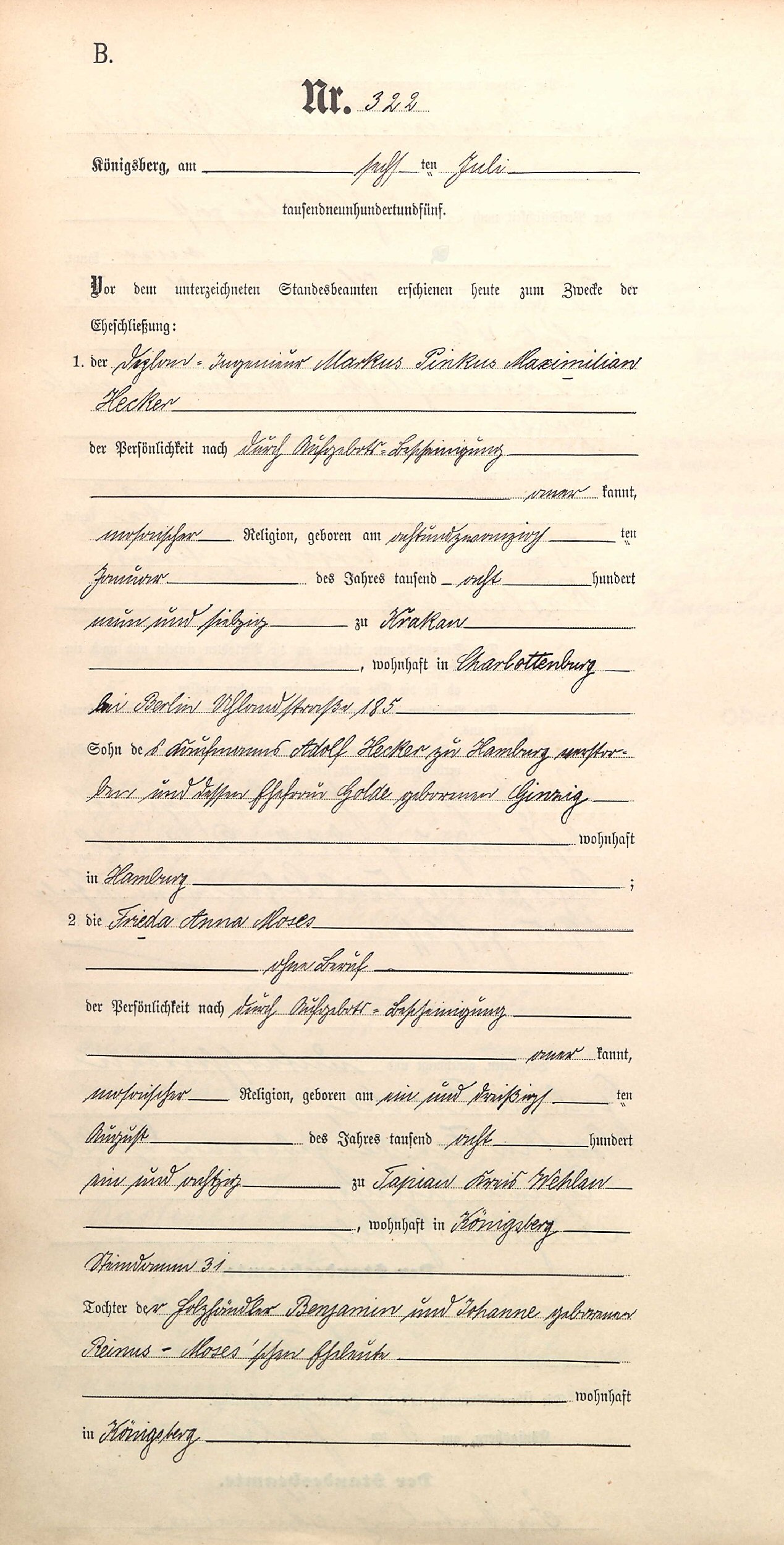 Notes for MARKUS PINKUS MAXIMILIAN HECKER: Son of Abraham Adolf and Golda (Guntzig) Hecker. Born: January 28, 1879 in Krakow, Poland. Died: Unknown in Unknown. Married: Frieda Anna Moses July 6, 1905 in Konigsberg, Pressen, Germany (Poland).