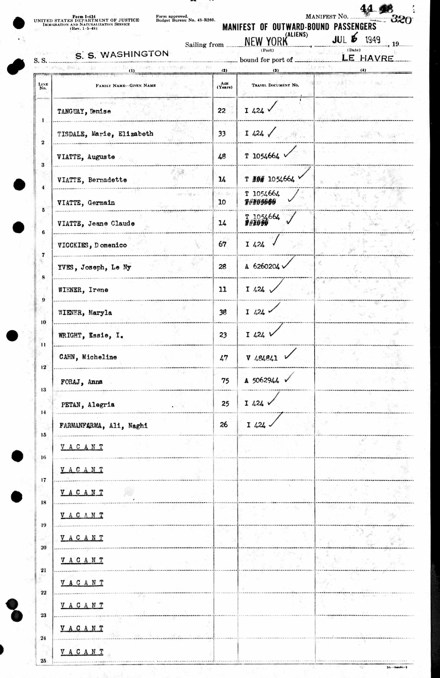 July 6, 1949 - New York, New York to Le Havre, France; Ship: S.S. Washington.