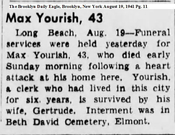 Buried: August 18, 1941 in Beth David Cemetery, Elmont, Nassau County, New York.