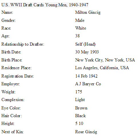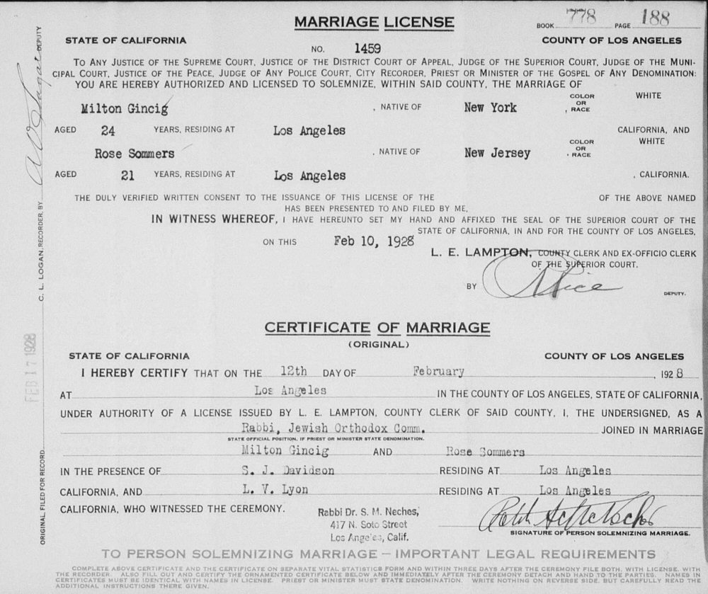 Married: Rose Sommers February 12, 1928 in Los Angeles, Los Angeles County, California.