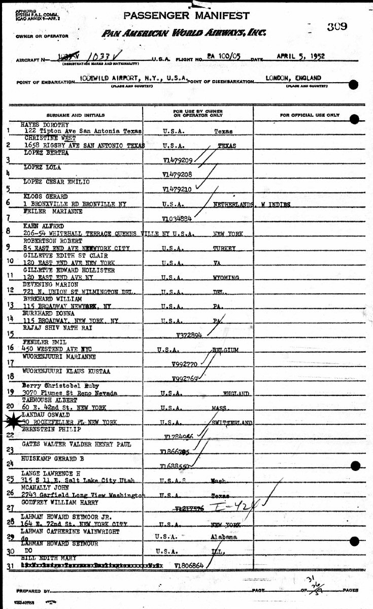 May 15, 1955 - Rio de Janeiro, Brazil to New York City, New York (PanAm Airlines) (w/Ruth)