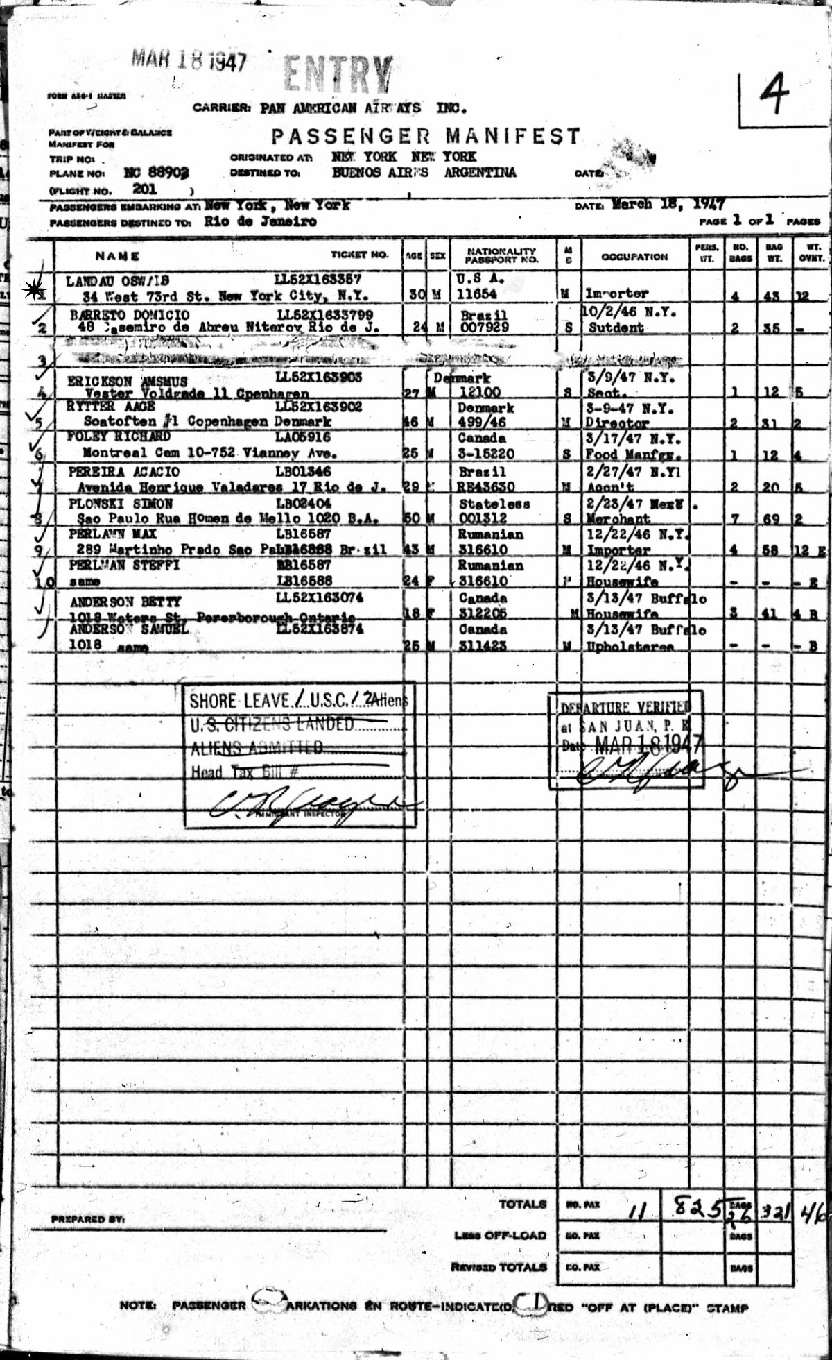 March 18, 1947 - San Juan Puerto Rico to U.S., Pan Am Airlines