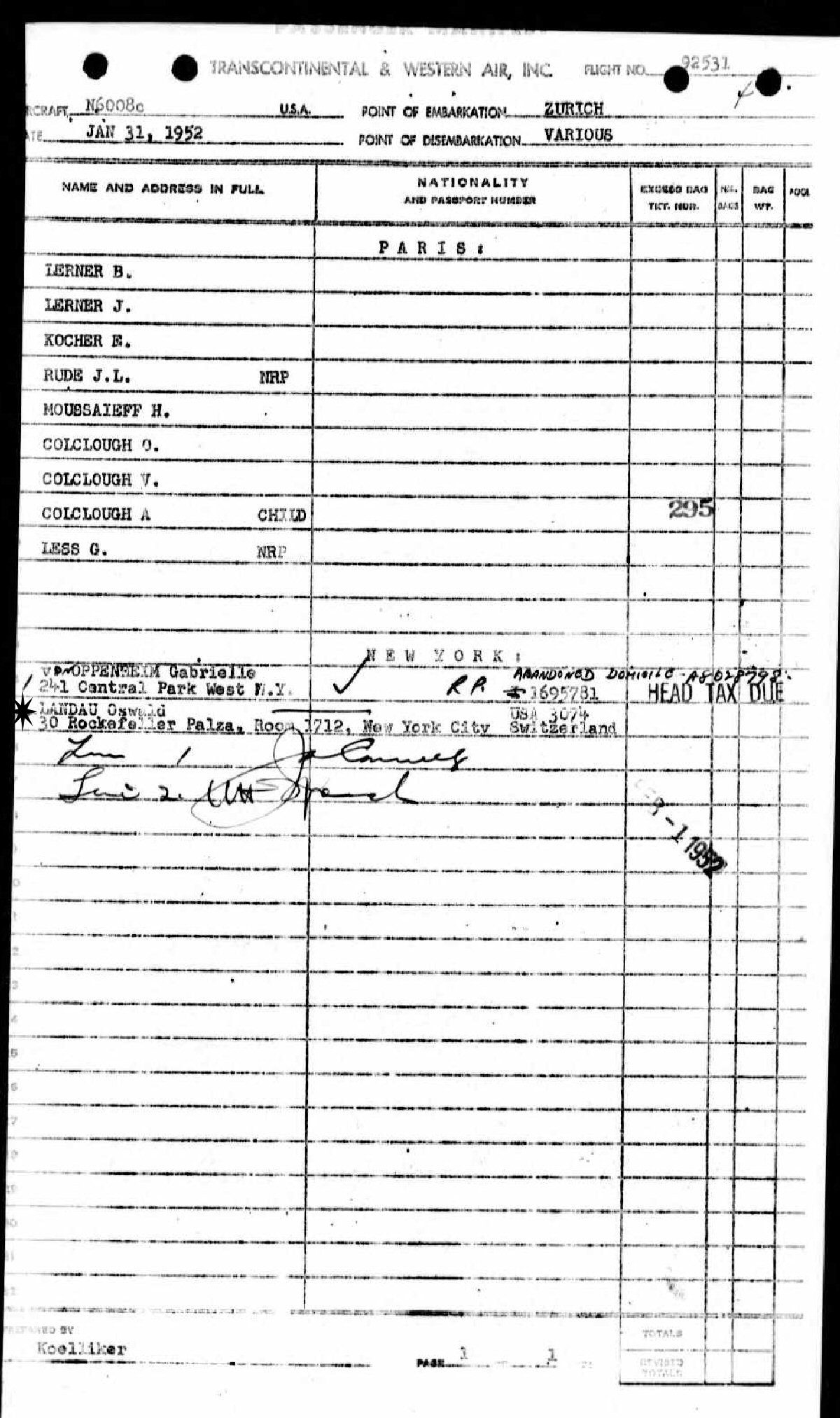 February 1, 1952 - Passenger List - Zurich, Switzerland to U.S. - TWA